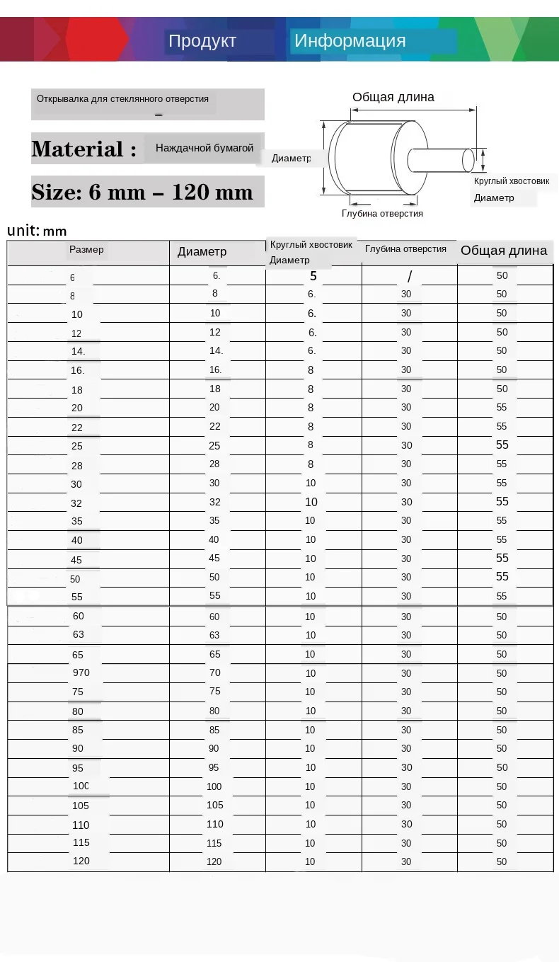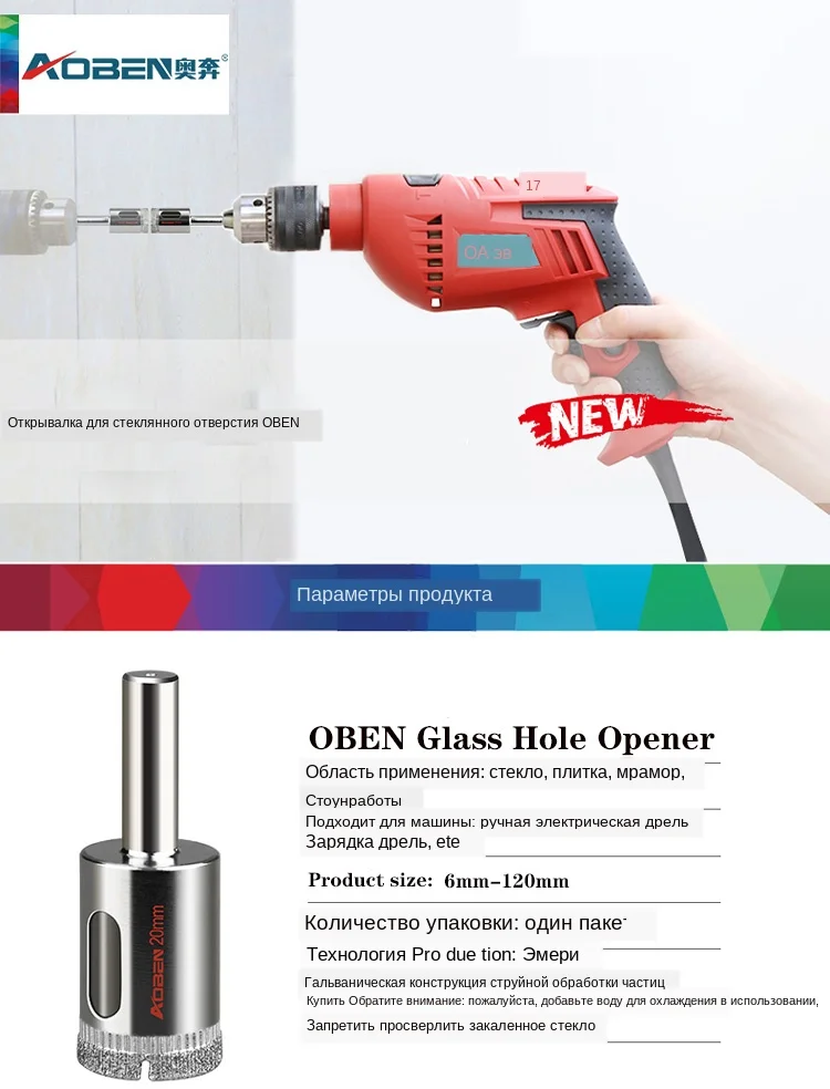 Инструкции 1. Установите дрель на сверлильный станок, такой как обычная электрическая дрель. 2. Потому что этот Открыватель отверстий не имеет центрального позиционирования сверла, пусть отверстие открывания начинается с 45 наклоняйте, замедляйте скорость электродрели и медленно прикасайтесь к стеклу, камню и т. Д. 3. Откройте прорезь полумесяца на стороне отверстия (слот Полумесяца играет роль позиционирования), а затем Вертикальная электрическая дрель начинает работать 4, в процессе открытия отверстия не должно быть слишком быстрым, обязательно продолжайте добавлять воду, чтобы охладить отверстие открывателя. Меры предосторожности 1. Охладите бит чистой водой при сверлении, хорошее охлаждение может значительно продлить срок службы бит Не сушить без добавления воды, иначе дрель будет легко повреждена. 2. Выберите материалы для обработки, не сверляйте с закаленным стеклом