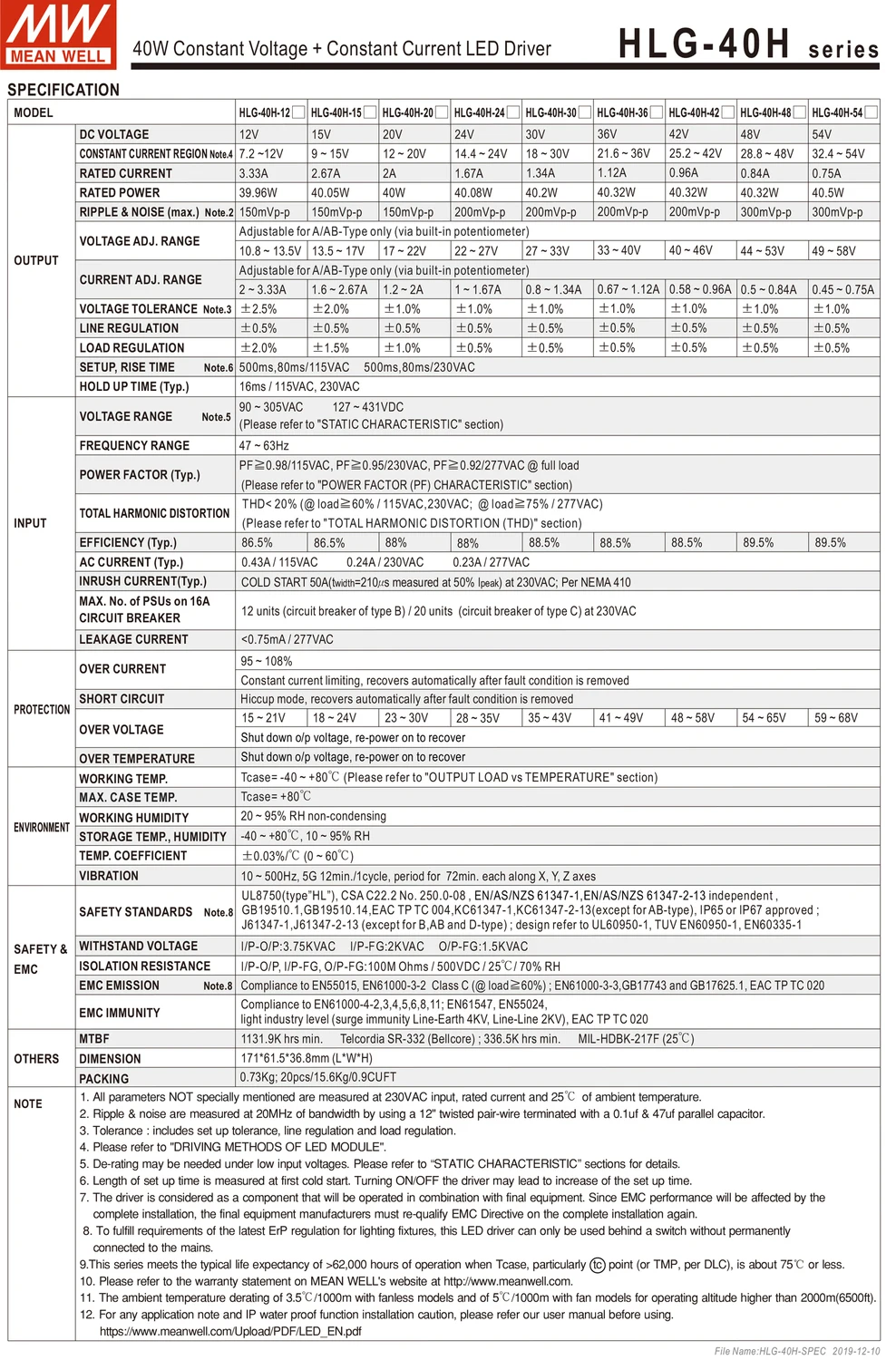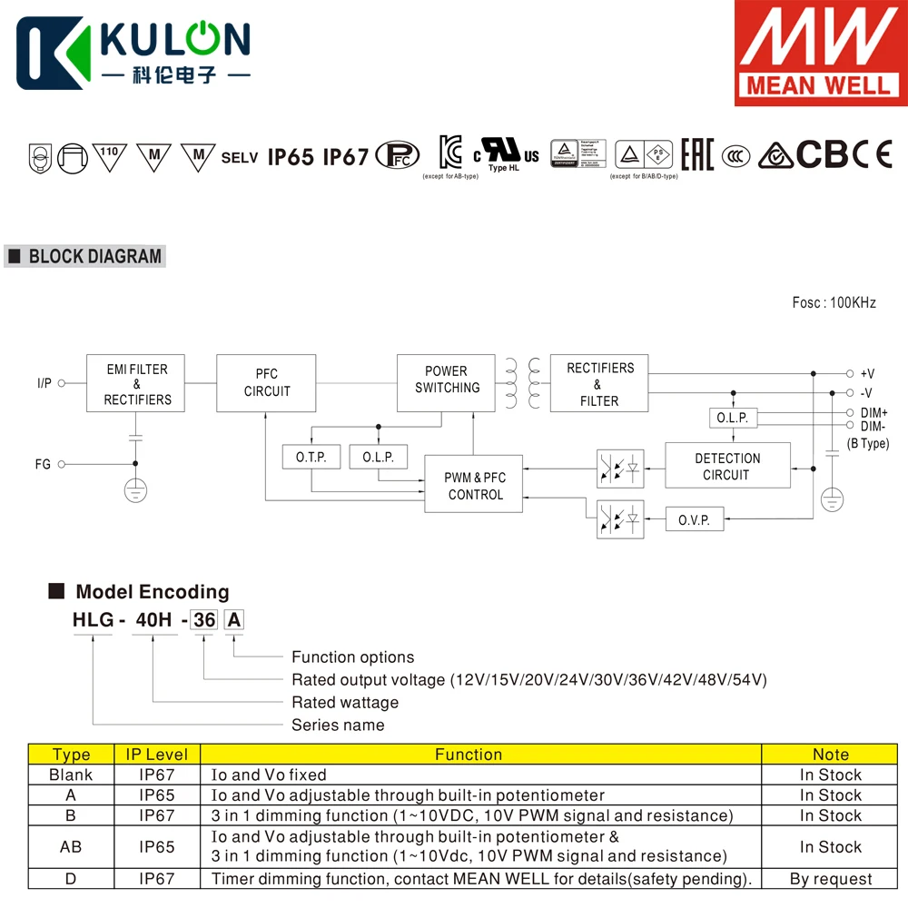 Серия HLG-40H-это светодиодный драйвер 40 Вт переменного/постоянного тока с двойным режимом постоянного напряжения и постоянного тока. HLG-40H работает от 90 ~ 305VAC и предлагает модели с различным номинальным напряжением от 12 В до 54 в. Благодаря высокой эффективности до 89.5%, с безвентиляторным дизайном, вся серия может работать для-40C ~ + 80 °C чехол с температурой при свободной конвекции воздуха. Конструкция металлического корпуса и уровень защиты от проникновения IP67/IP65 позволяет этой серии подходить как для внутреннего, так и для наружного применения. HLG-40H оснащен различные функциональные опции, как, например, затемнения методики, таким образом, чтобы обеспечить оптимальную гибкость конструкции для Светодиодный система освещения.