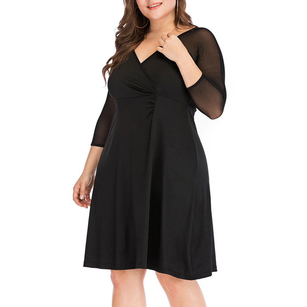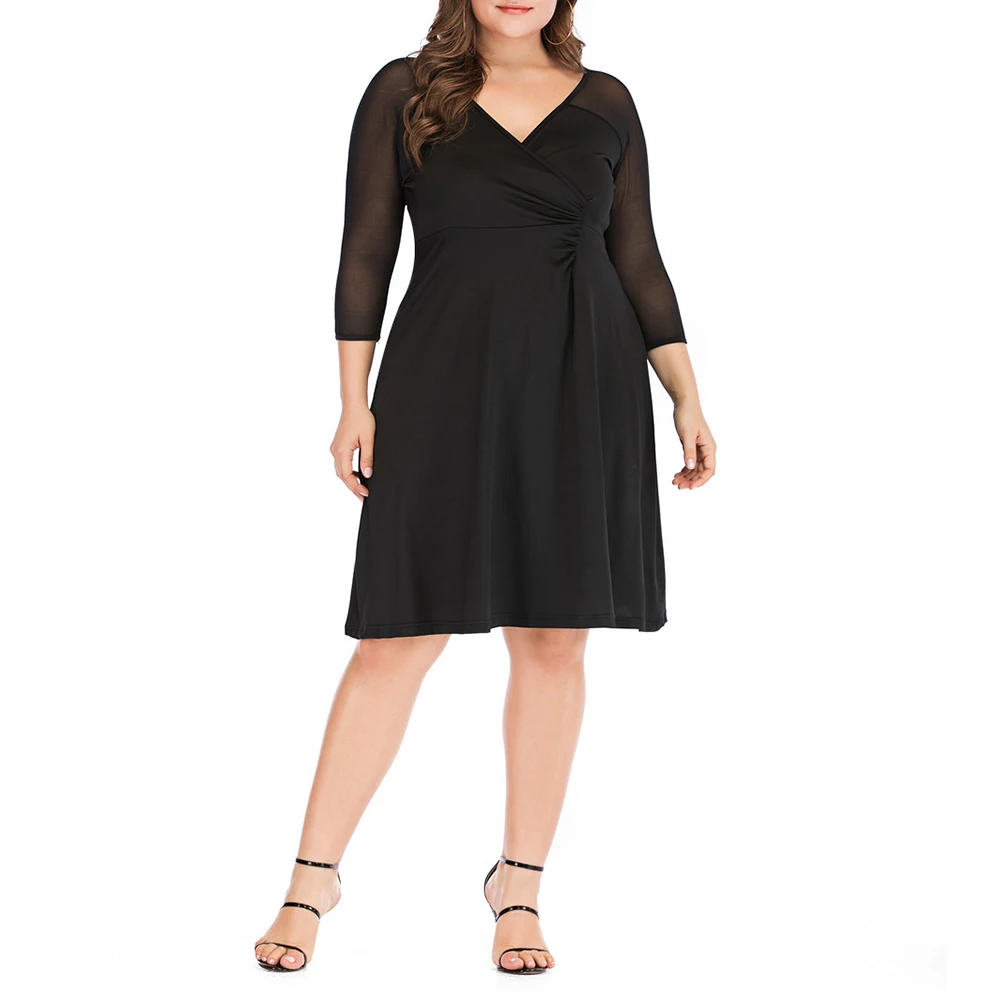 Женское однотонное классическое платье, черное газовое лоскутное платье с 3/4 рукавами и высокой талией, элегантное Европейское и американское платье большого размера