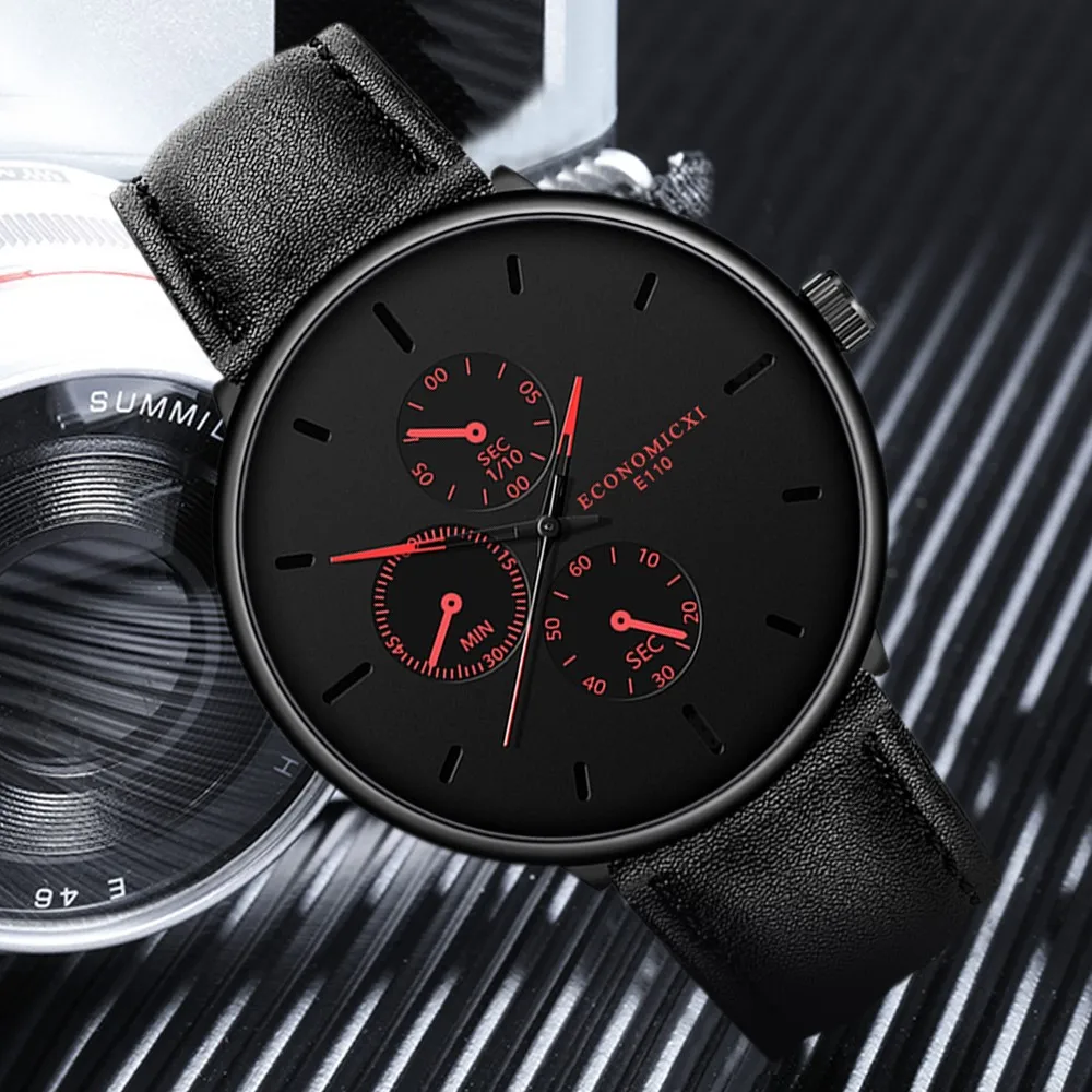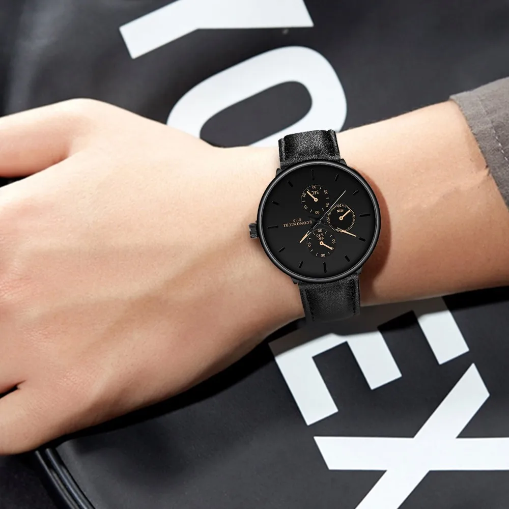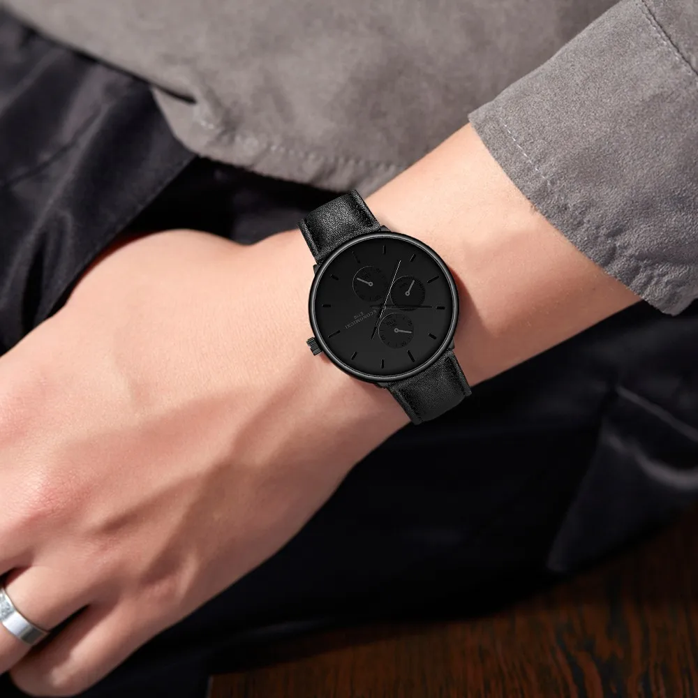Мужские часы модные черные деловые наручные часы Простой Кожаный ремешок с тремя глазами кварцевые часы montres hommes reloj pulsera hombre L