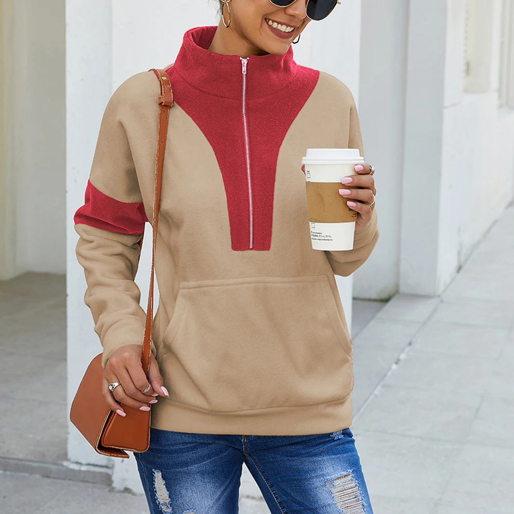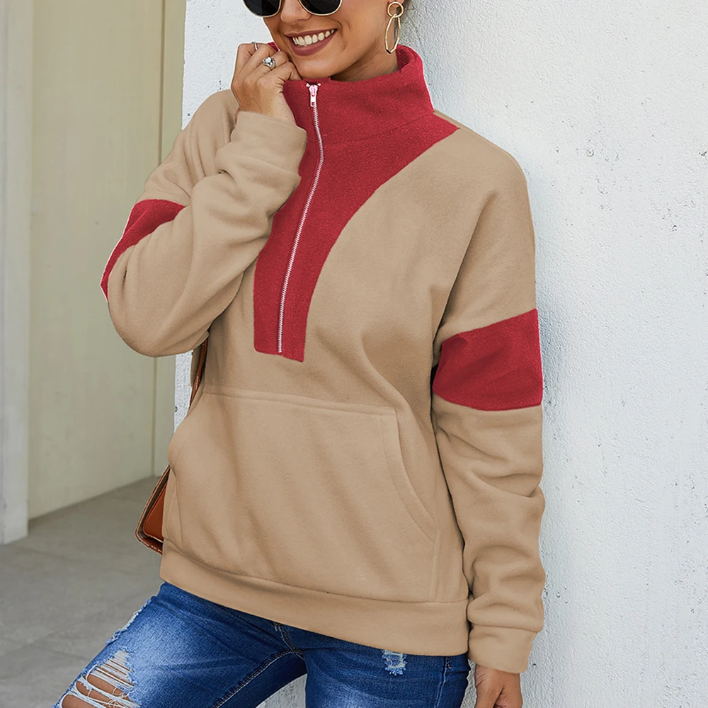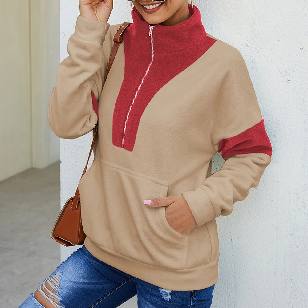 Женская новая осенне-зимняя Толстовка с длинным рукавом в стиле пэчворк с высоким воротником Теплые Топы на молнии с большим карманом