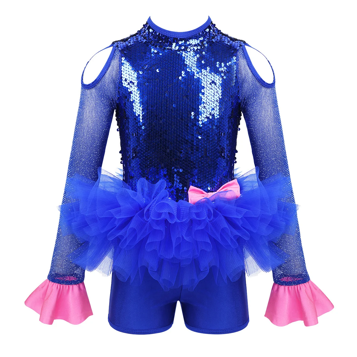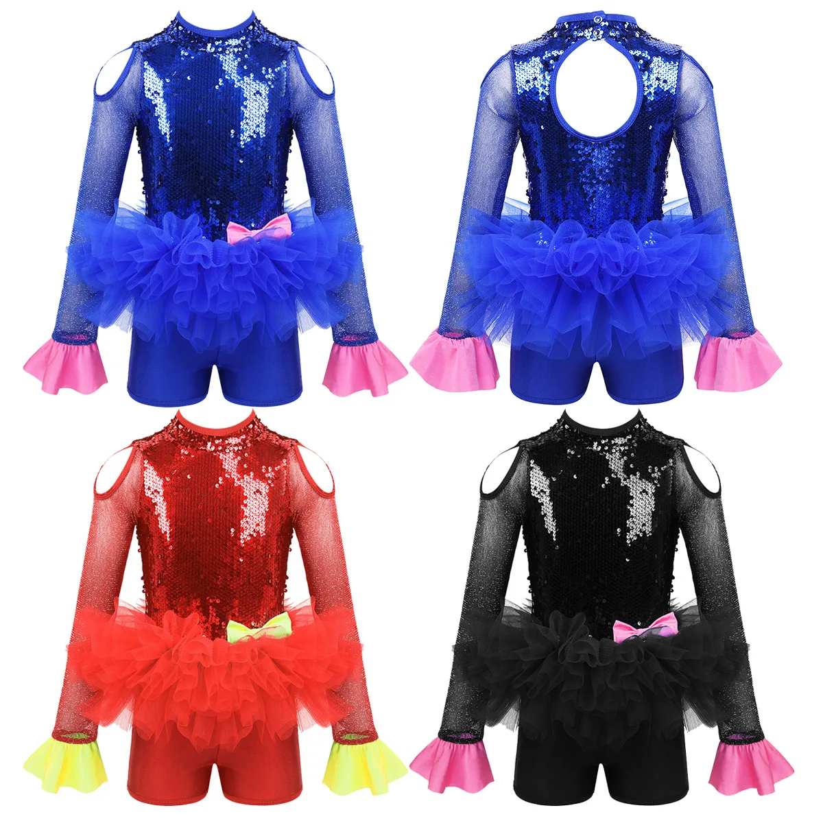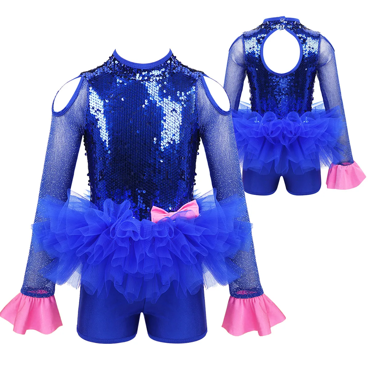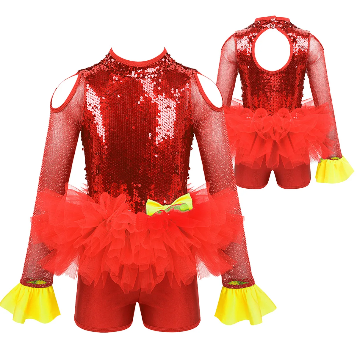 Комбинезон для танцев изготовлен из полиэстера, пайеток и сетчатого материала, ручная стирка. Таблица размеров означает возрастные диапазоны для девочек, но они приведены только для общего ознакомления. Длинные рукава из тюля с расклешенными манжетами, ложная горловина с застежкой на кнопки сзади. Блестящие пайетки на лифе, вырезы на плечах и спине. Талия украшена несъемным бантом спереди. Многослойные пушистые сетчатые оборки на талии. Красивая Одежда для танцев для вашей девочки. Подходит для лирического, современного, современного танца или выступления на сцене и т. Д.