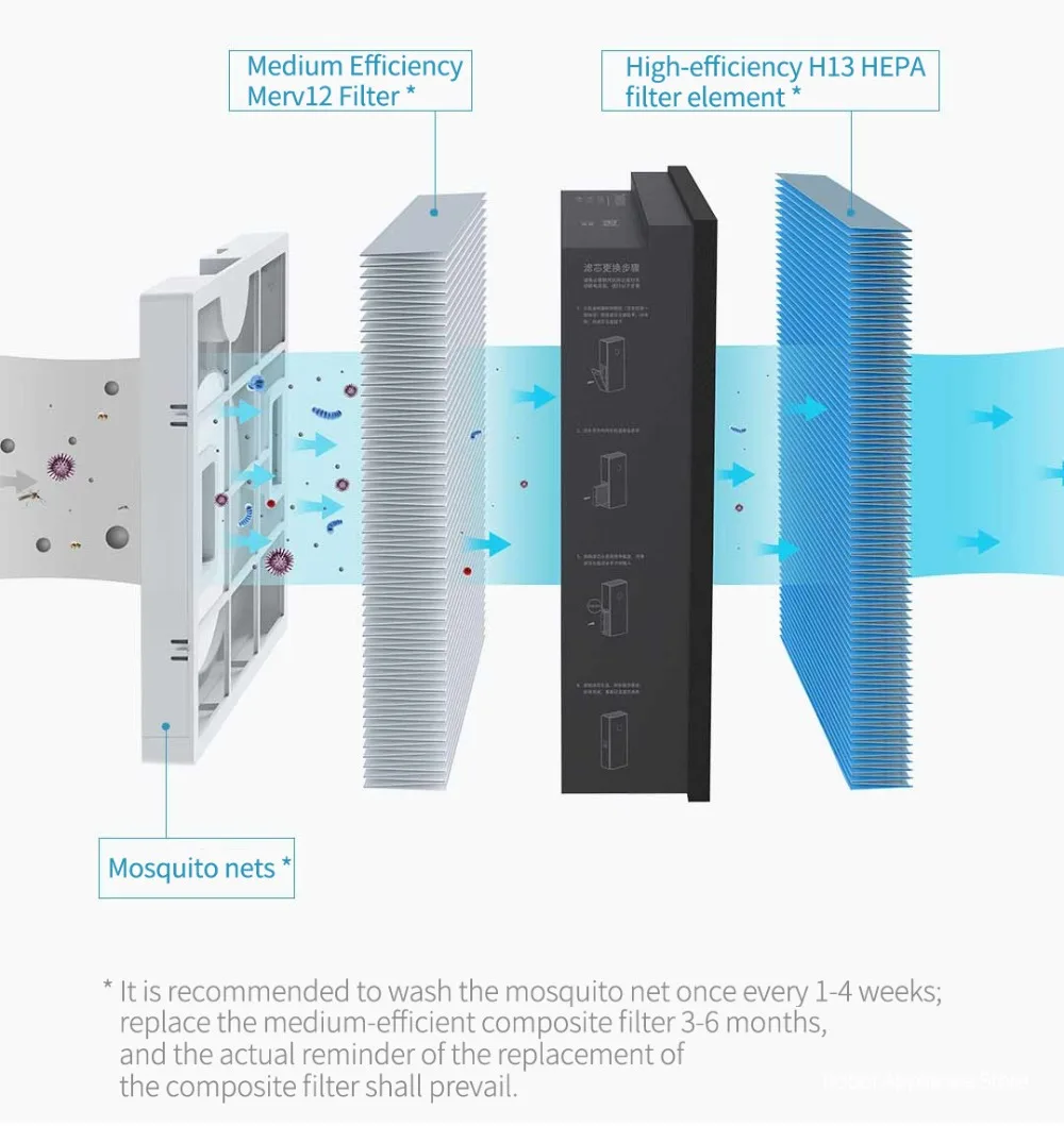-Эффективный фильтр H13 класса HEPA + фильтр средней эффективности Merv12 интегрирован в Композитный фильтр. Две фильтрующие функции имеют дополнительные преимущества для достижения баланса жизни и производительности. Москитная сетка может легко блокировать на открытом воздухе для floc, комаров и волос.