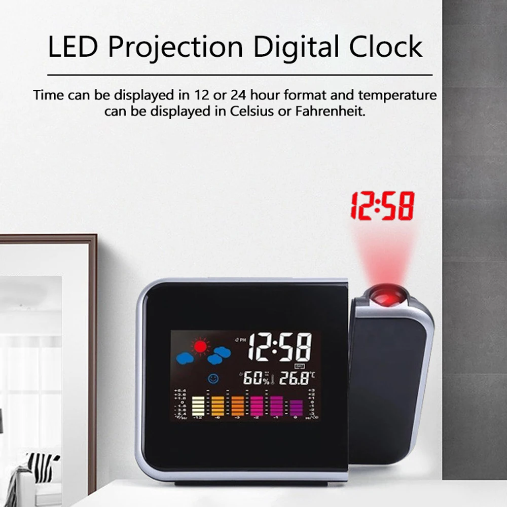 Получите всю необходимую информацию, чтобы пройти через день после пробуждения. Эти часы имеют полноцветный экран, который отображает время, температуру, влажность и проектирует время на любую стену или потолок. Он также имеет функцию будильника, поэтому вы никогда не пропустите удар. Работает на 2 батареях AAA (не входят в комплект).