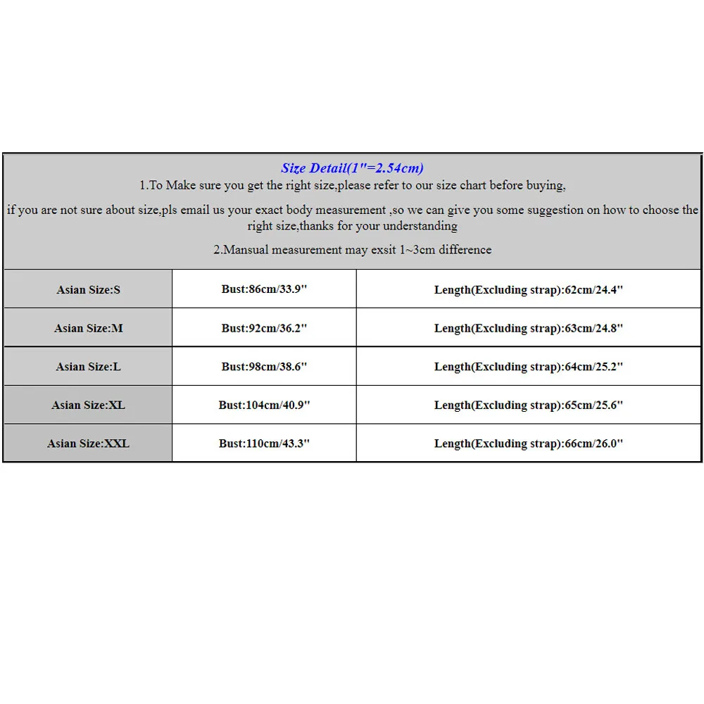 Азиатский Размеры: S Обхват груди:86 см/33,9" Длина: 62 см/24,4 дюйма Азиатский Размеры: М Обхват груди:92 см/36,2" Длина: 63 см/24,8 дюйма Азиатский Размеры: L Обхват груди:98 см/38,6" Длина: 64 см/25,2 дюйма Азиатский Размеры: XL Обхват груди: 104 см/40,9" Длина: 65 см/25,6 дюйма Азиатский Размеры: XXL Обхват груди: 1Высота каблука 10 см/43,3" Длина: 66 см/26,0 дюйма