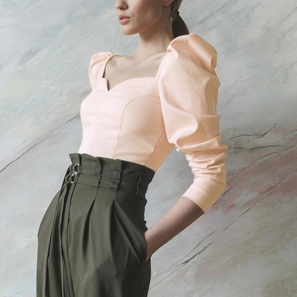 Женская сексуальная облегающая Облегающая рубашка с v-образным вырезом и пышными длинными рукавами, вечерние Стрейчевые блузы, однотонные Топы Twotwinstyle, повседневные топы Mujer