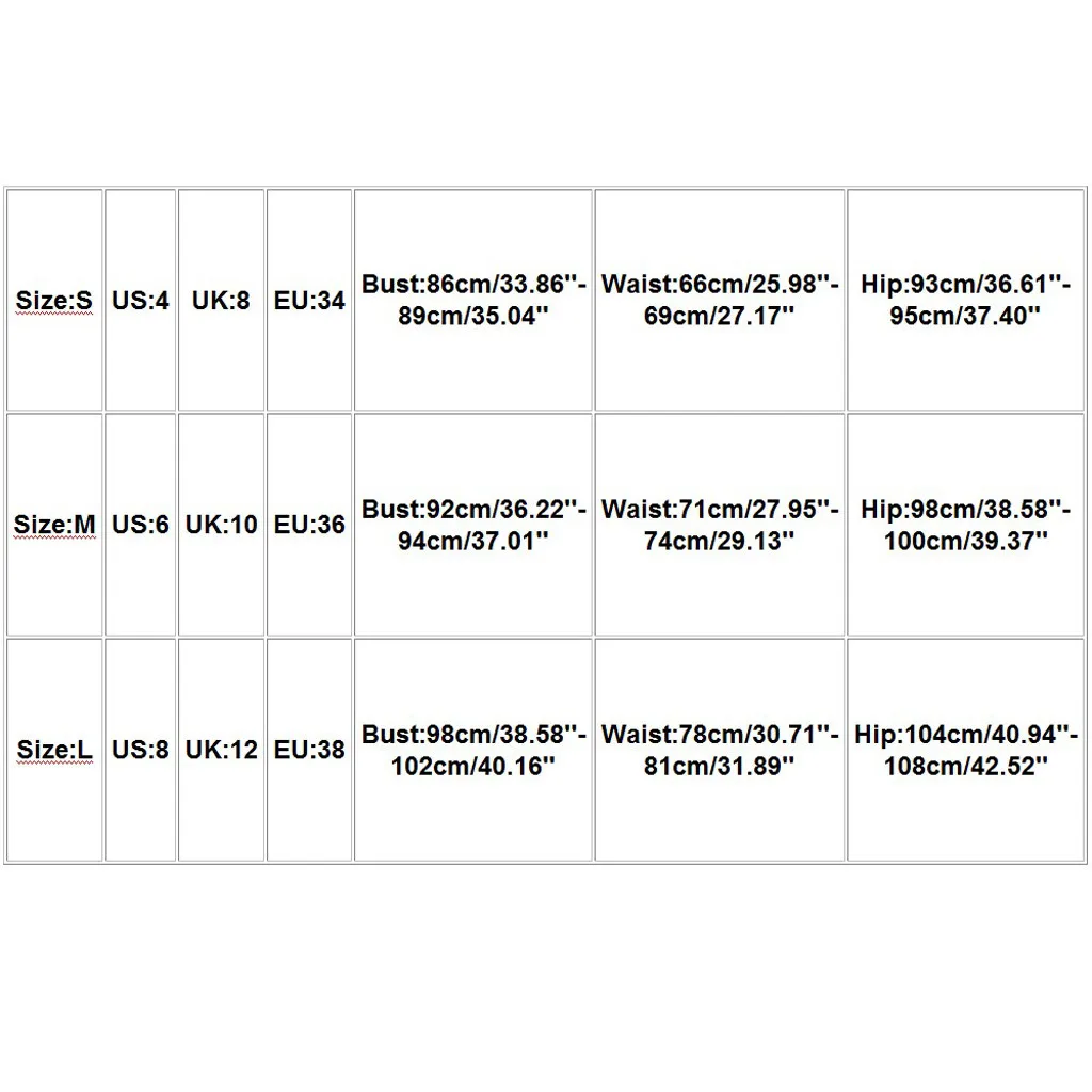 Size US UK EU Bust Waist Hip S 4 8 34 86cm/33.86''-89cm/35.04'' 66cm/25.98''-69cm/27.17'' 93cm/36.61''-95cm/37.40'' M 6 10 36 92cm/36.22''-94cm/37.01'' 71cm/27.95''-74cm/29.13'' 98cm/38.58''-100cm/39.37'' L 8 12 38 98cm/38.58''-102cm/40.16'' 78cm/30.71''-81cm/31.89'' 104cm/40.94''-108cm/42.52''