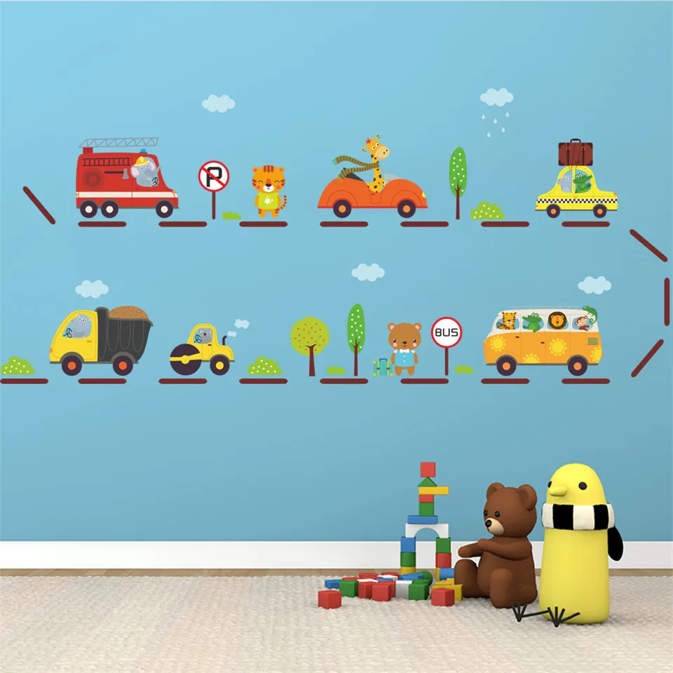 Мультяшный стикер на стены, автомобили для детской комнаты, домашний декор, магазин, художественная настенная наклейка, сделай сам, самоклеющийся ПВХ постер, дизайн детского сада