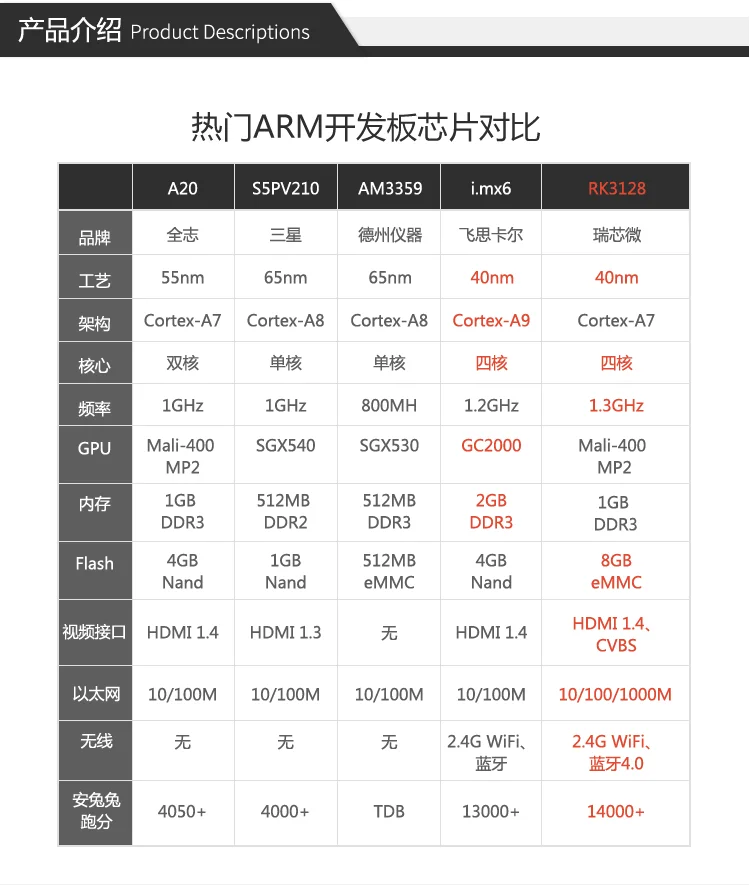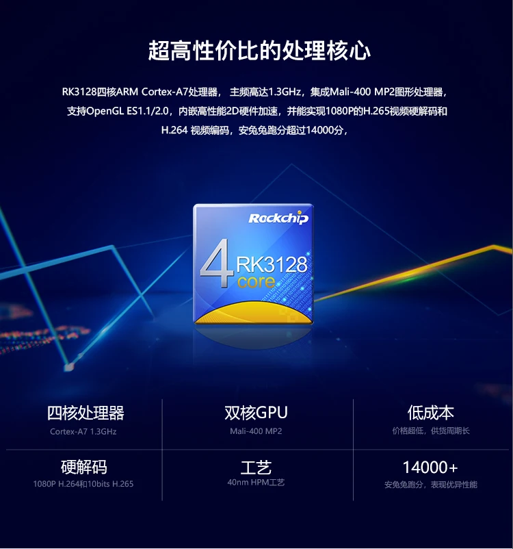 Firefly-RK3128 использует cortex-a7 архитектуру, четырёхъядерный процессор 1,3 ГГц и интегрирует mali-400mp2 GPU с отличными возможностями обработки вычислений и графики. Встроенный гигабитный Ethernet порт, Wi-Fi 2,4 ГГц и bluetooth 4,0