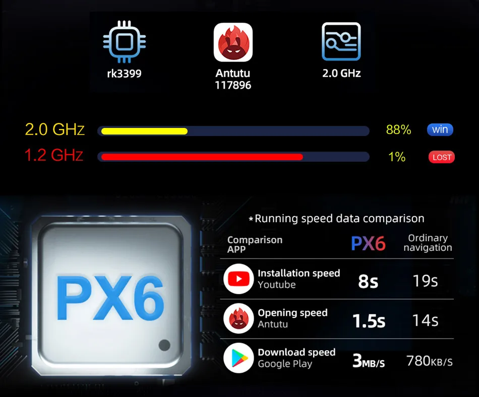 Самый быстрый Процессор PX6 Тест 4G + 64G версия, ANTUTU может достигать 117896 Это очень большое количество Для автомобиля мультимедийный плеер