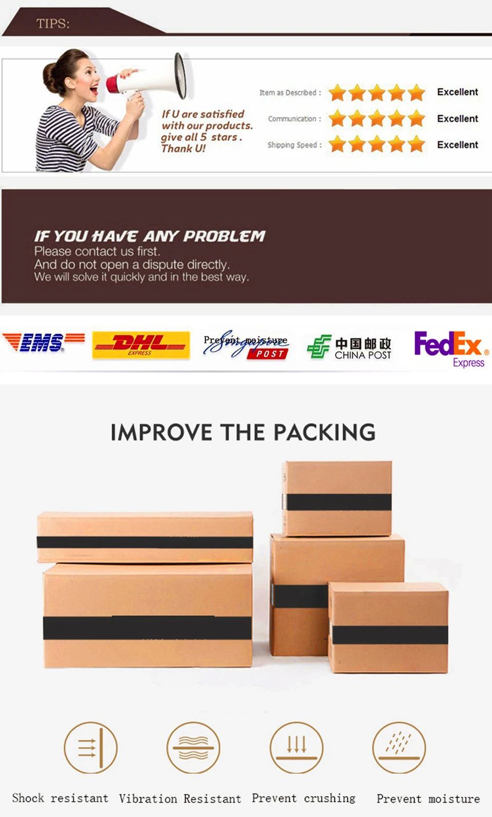 2: Если вы удовлетворены нашими продуктами и услугами, пожалуйста, дайте нам положительные отзывы (пять звезд) в качестве награды, если вы не удовлетворены, вы можете связаться с продавцом в любое время, чтобы справиться с этим.
