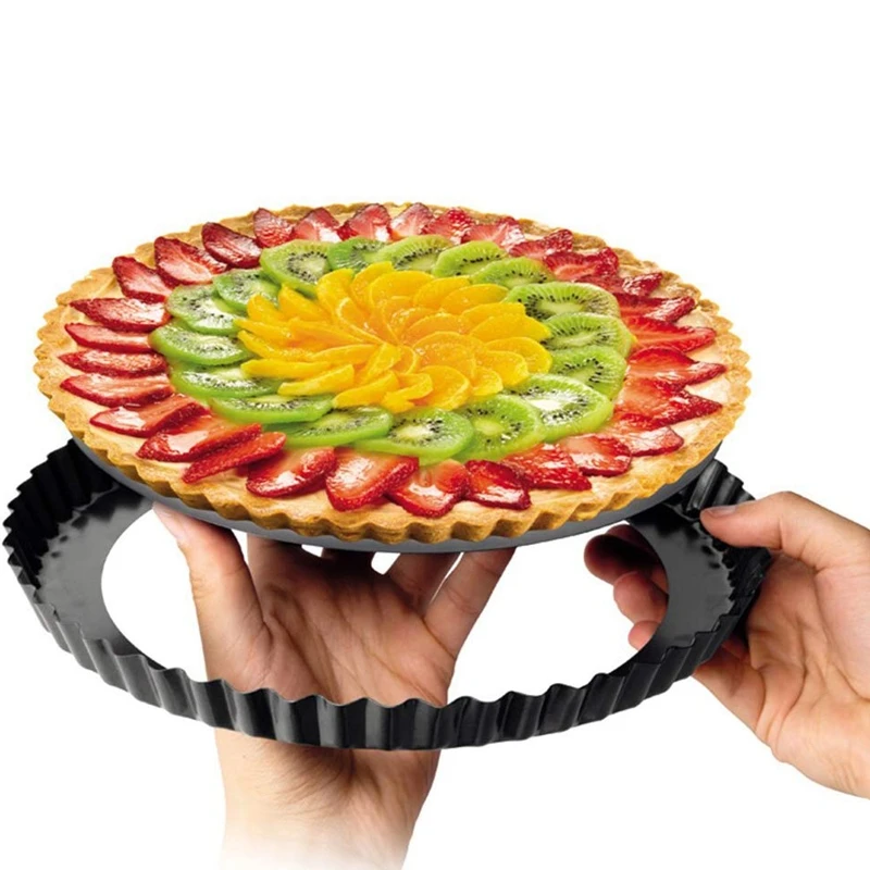 Способен удерживать и содержать тяжелые ингредиенты киче или фруктового пирога. Примечание: слишком влажные ингредиенты не рекомендуется, это может течь. Антипригарное покрытие/съемное Съемное основание обеспечивает легкое снятие и очистку.
