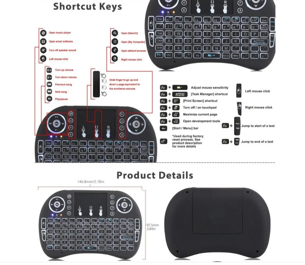 1. Большой трекпад, уникальный дизайн с двумя клавишами мыши, более удобное управление 2. Регулируемая скорость мыши, регулировка двух скоростей 3. Видение литий-ионного аккумулятора: Nokia, мобильный телефон, универсальный (BL 5C), литиевая аккумуляторная батарея, бесплатная замена батареи Зрение аккумулятора AAA: аккумулятор AAA не входит в посылка, функция видения аккумулятора AAA не поддерживает зарядку. 4. Игровая клавиатура пальмового размера, обтекаемый дизайн