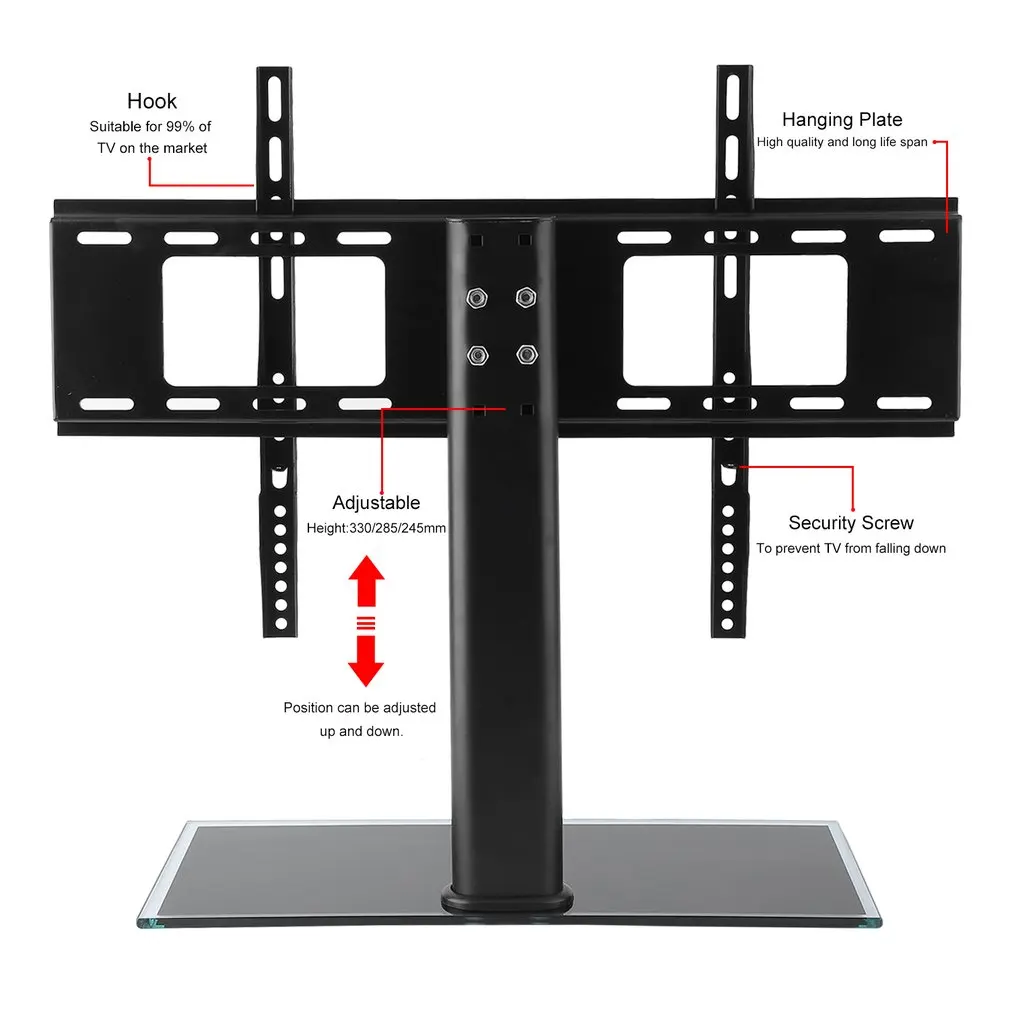 Характеристики: защитный винт для предотвращения падения телевизора. Положение можно регулировать вверх и вниз. Эта современная консоль ощущает светильник и открывается, но она обеспечивает отличные функции, необходимые для правильного отображения плоского панельного телевизора. Расширенный задний позвоночник поддерживает крепление телевизора 32-55 дюймов. Прочное черное закаленное стекло для безопасности. Описание: длительный срок службы подходит для телевизора 37-55 дюймов. Высокая производительность и супер сильная, стабильная. Изготовлен из закаленного материала для дополнительной прочности. Высота руки может быть регулируемой. Спецификация: Цвет: черный размер изделия: 66*49 см размер посылка: 68*26*6 см Максимальная нагрузка 60 кг (135lbs) рекомендуемый размер телевизора: 37-55 дюймов Материал: трубка из закаленного стекла и стали