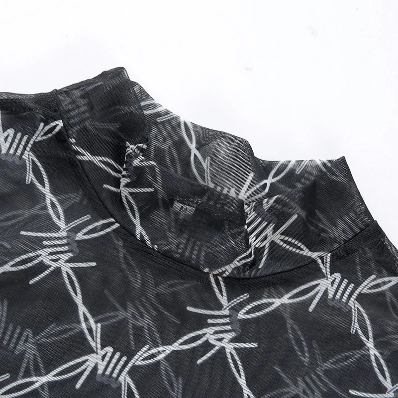 Сетчатые сексуальные прозрачные топы с длинным рукавом, черные повседневные футболки с принтом цепи, женская уличная винтажная модная футболка