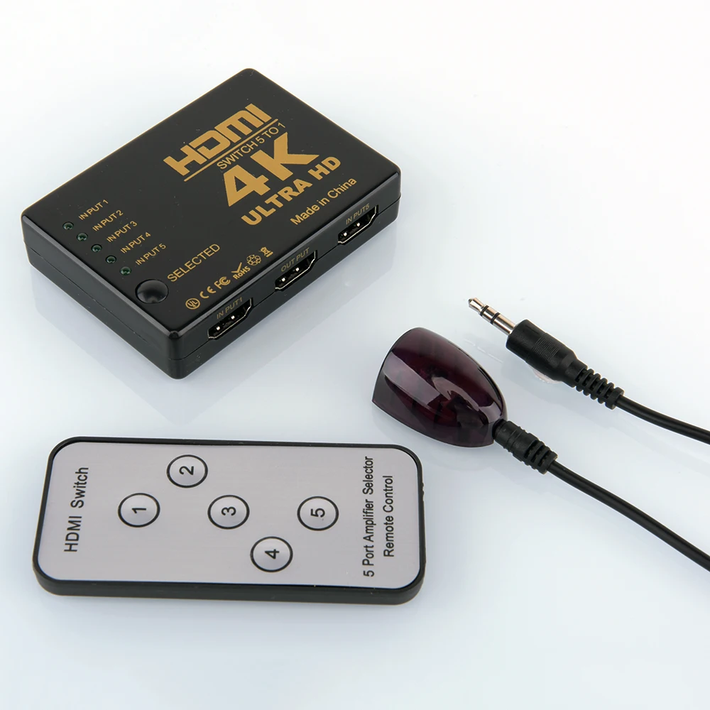5 портов HDMI Switch-это высокопроизводительный HDMI switcher, он обеспечивает возможность переключения между несколькими источниками HDMI, такими как ноутбук, HD-DVD, PS3, Xbox360 на один hdmi-телевизор или дисплей. Он позволяет переключать 5 входов и поддерживает все компоненты сигнала, присутствующие в кодированном шифровании HDCP сигнала. Примечание 1. Рекомендуется использовать кабель HDMI 1,4 в качестве входного исходного кабеля; Не поддерживает ТВ-палку. 2. Рекомендуемый входной кабель HDMI меньше или равен 15 футов, выходной кабель HDMI меньше или равен 30 футов. 3. Перед использованием снимите пластиковый зажим с пульта дистанционного управления.