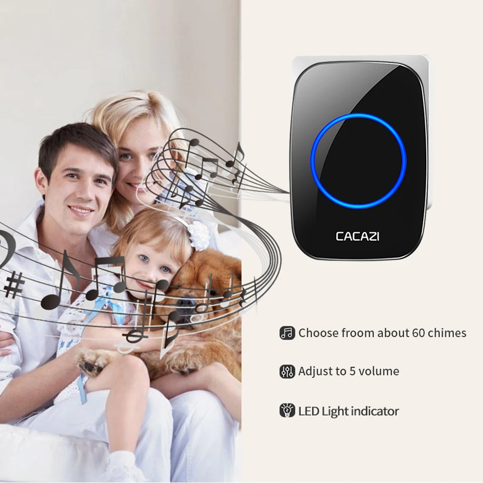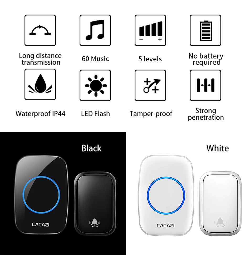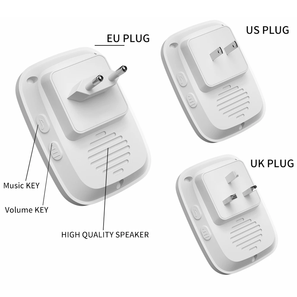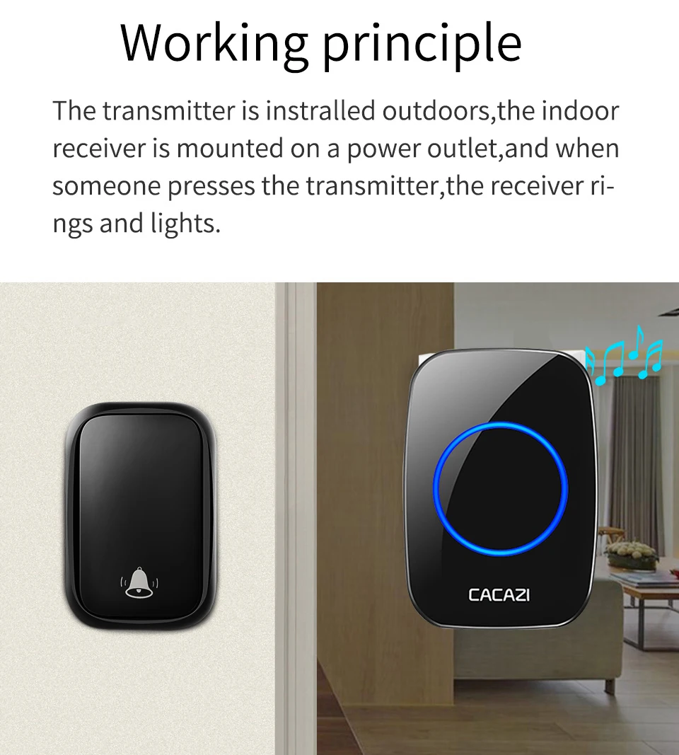 1. Нажмите кнопку, супер обучающий код может свободно научиться сочетать, может быть неограниченным подходящим приемником. 2. Вместо использования батареи, кнопка преобразует кинетическую энергию в электрическую и посылает сигнал при нажатии. 3. Передатчик может нормально работать в снежной или высокой температуре окружающей среды, водонепроницаемый и пыленепроницаемый. 4. Если несколько кнопок соединены с одним или несколькими приемниками в одной системе, каждая кнопка может быть установлена на другой мелодии звонка. 5. Функция отключения памяти: Включите питание снова после выключения питания, не нужно повторно регулировать и блокировать мелодию звонка. 6. Приемник доступен в различных вилках, штепсельных вилках США/ЕС/Великобритании и адаптерах Австралии, подходит для большинства стран. 7. Привлекательная подсветка мигает, когда кто-то толкает дверной звонок. Особенно подходит для пожилых, глухих и беременных женщин. 8. Напряжение приемника составляет 220 В. 9. Приёмник находится на расстоянии 150 метров (в открытой местности), что может зависеть от окружающей среды и препятствий. 10. Приемник имеет 60 мелодий звонка на выбор, а громкость 0-110 дБ на 5 уровнях. 12. Просто подключите приемник к электрической розетке, передатчик кнопки может быть приклеен к двери с помощью прилагаемых клейких лент. Примечание: Кнопка не может быть размещена на железной двери, потому что это будет мешать сигналу. Если приемник не звонит при нажатии кнопки после получения дверного звонка, Пожалуйста, подключите дверной звонок.
