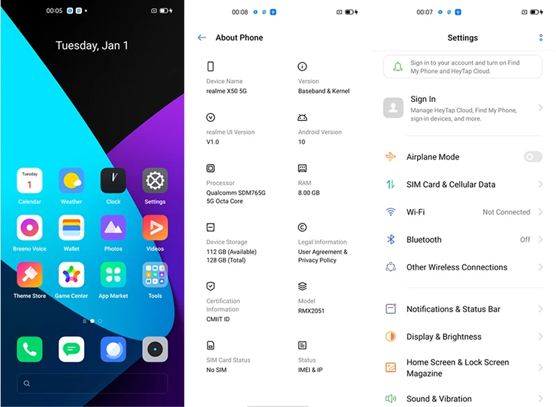 Китайская версия realme X50 64MP AI Quad CameraRAM+ ROMRAM (LPDDR4X); ROM (UFS 2,1) ; 8 ГБ + 128 ГБЦПВосьмиядерный Snapdragon 765G до 2,4 Гц (7 нм EUV) ; Графический процессор: Adreno 620Задняя камера64 мп (GW1) + 12MP + 8MP + 2MP Quad камера ; 20x Гибридный зум; Поддержка UIS и UIS MaxФронтальная камера16 МП (Sony-IMX 471) + 8 Мп AIАккумулятор4200 мАч (Typ) ; 30 Вт VOOC быстрое зарядное устройствоДисплей6,57 дюйма;2400x1080HD + Полный экран ; Соотношение экрана: 90.4%; Стекло Corning Gorilla 5ОСПользовательский интерфейс realme на базе Android 10,0Слот для картыНано сим * 2ХарактеристикаNFC, Двойной GPS ; OTA Update, Face ID,Bluetooth5.0;DolbyСеть5G NR:n1 */n41/n78/n79