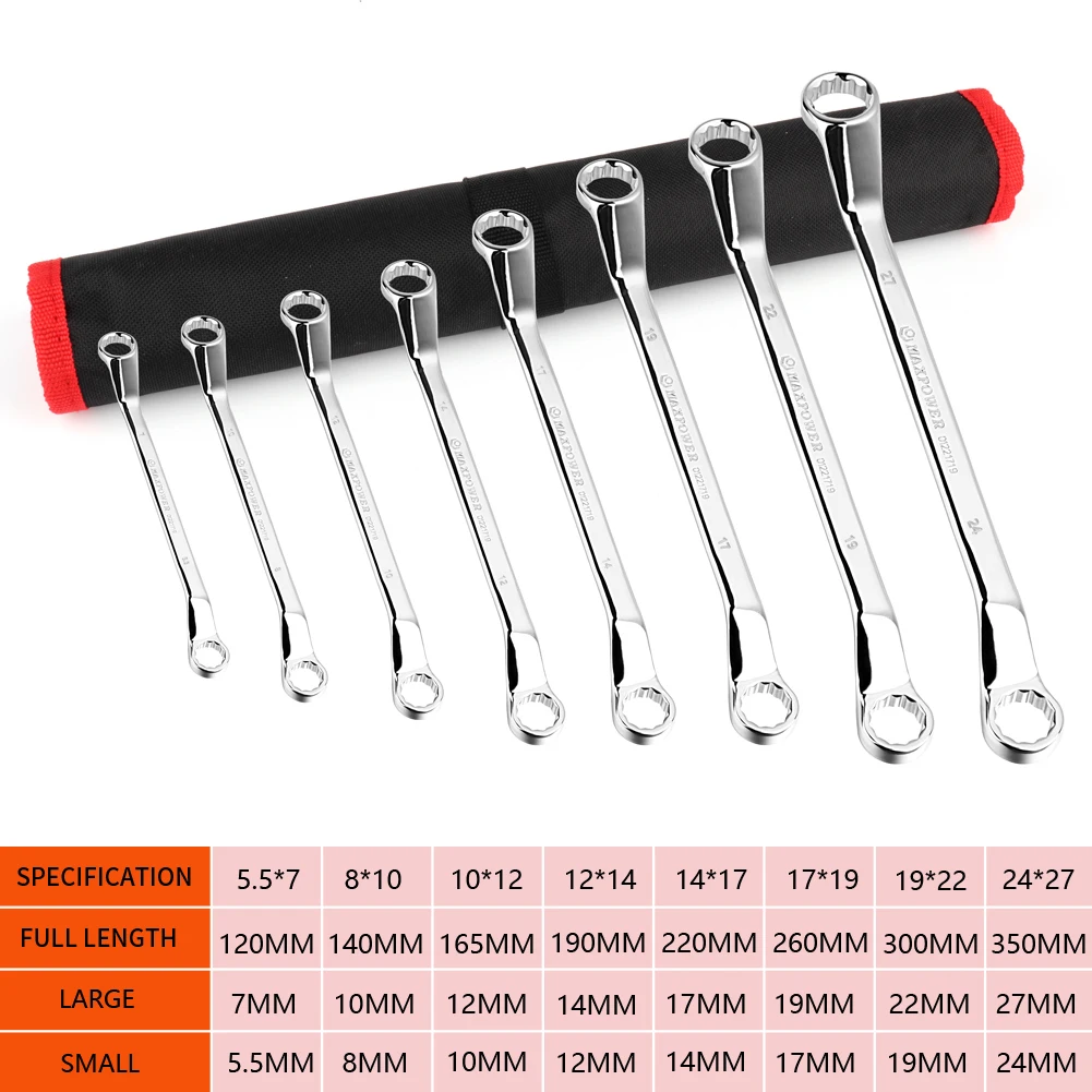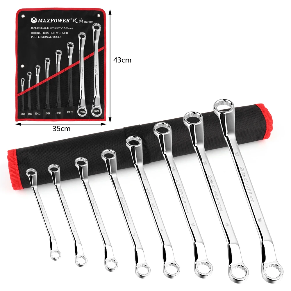 Высококачественный набор изготовлен из хромированной ванадиевой стали. Полностью отполированный и закаленный для ржавчины и коррозионной стойкости Набор из 8 двойных колец/набор звездочных гаечных ключей Размеры отмечены на гаечном слое для легкого и быстрого поиска. Руководство по размерам: 8 шт.: 5,5*7,8*10,10*12,12*14,14*17,17*19,19*22,24*27 мм Поставляется в рулоне инструмента для удобного хранения и транспортировки. Включает: 8 шт. * гаечный ключ