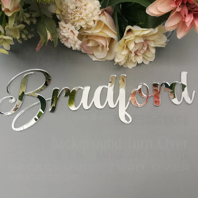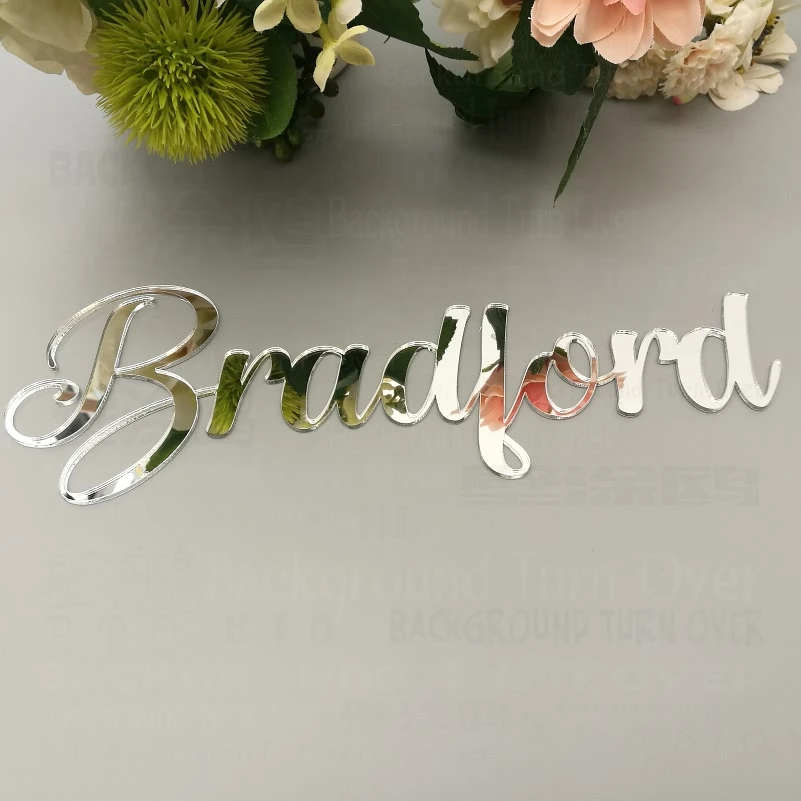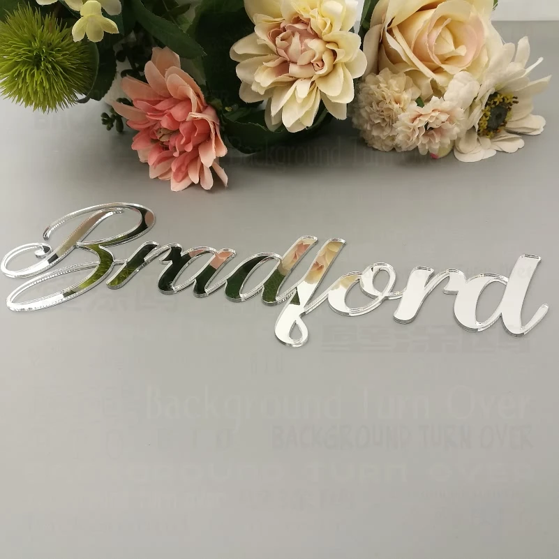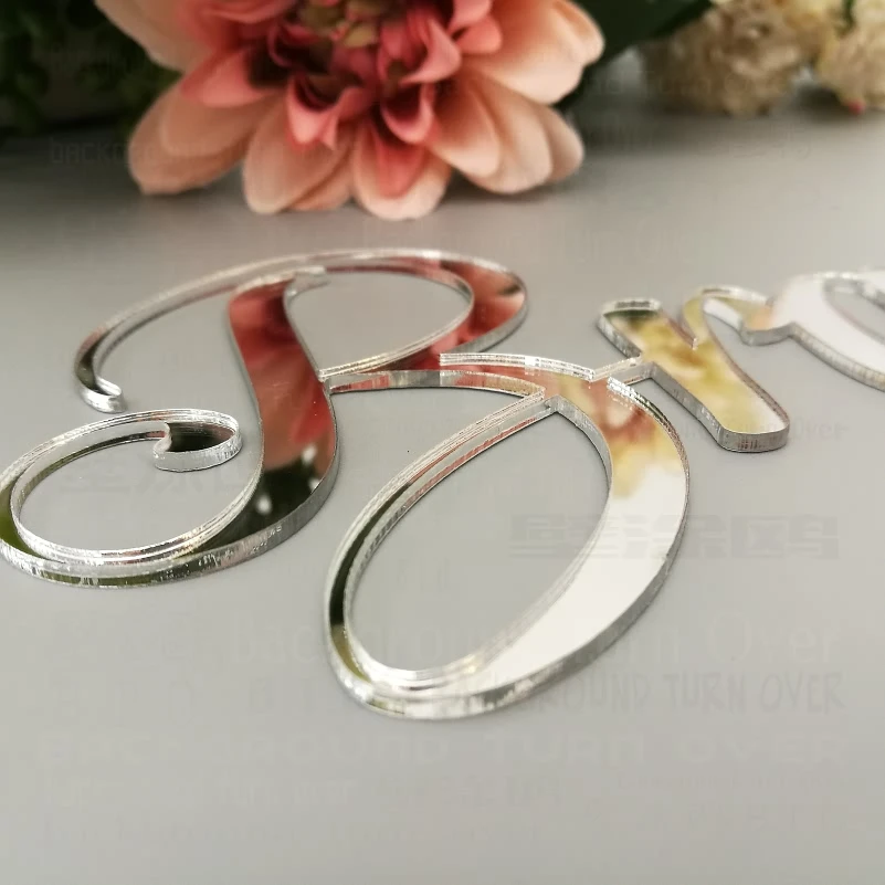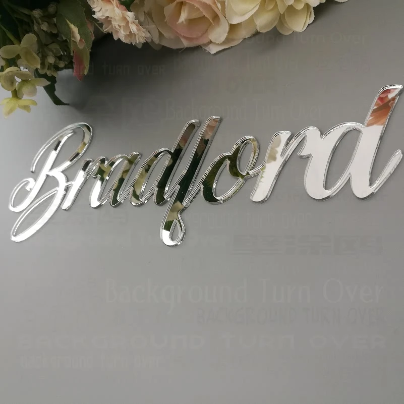 Бренд: фон переворачивается Продукт: Индивидуальные имена зеркальной поверхности Материал: акриловое зеркало Толщина: 2 мм Мы принимаем индивидуальный заказ, пожалуйста, сообщите нам ваши персональные имена Применение: спальня, гостиная, ванная комната, детская комната, дверной знак, магазин, свадьба, день рождения, отжиг, праздник, вечерние, фон