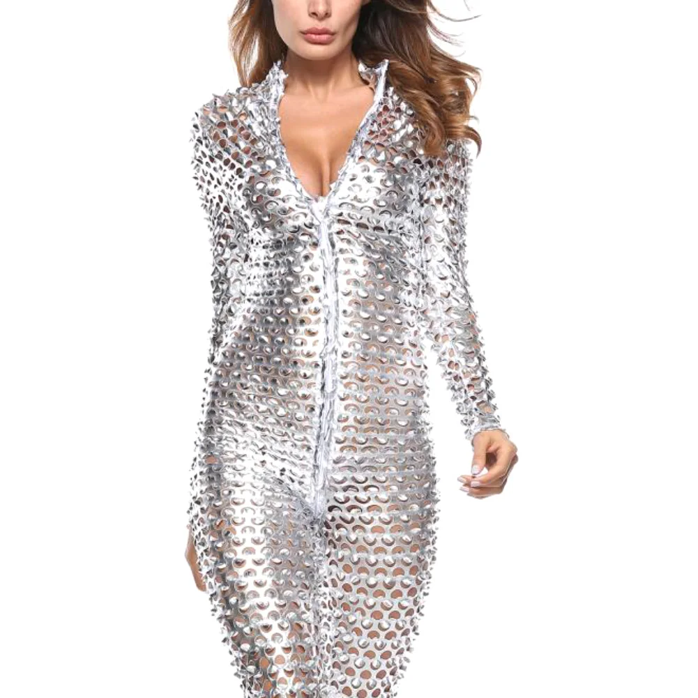 Женский сетчатый Облегающий комбинезон из искусственной лакированной кожи на молнии для ночного клуба