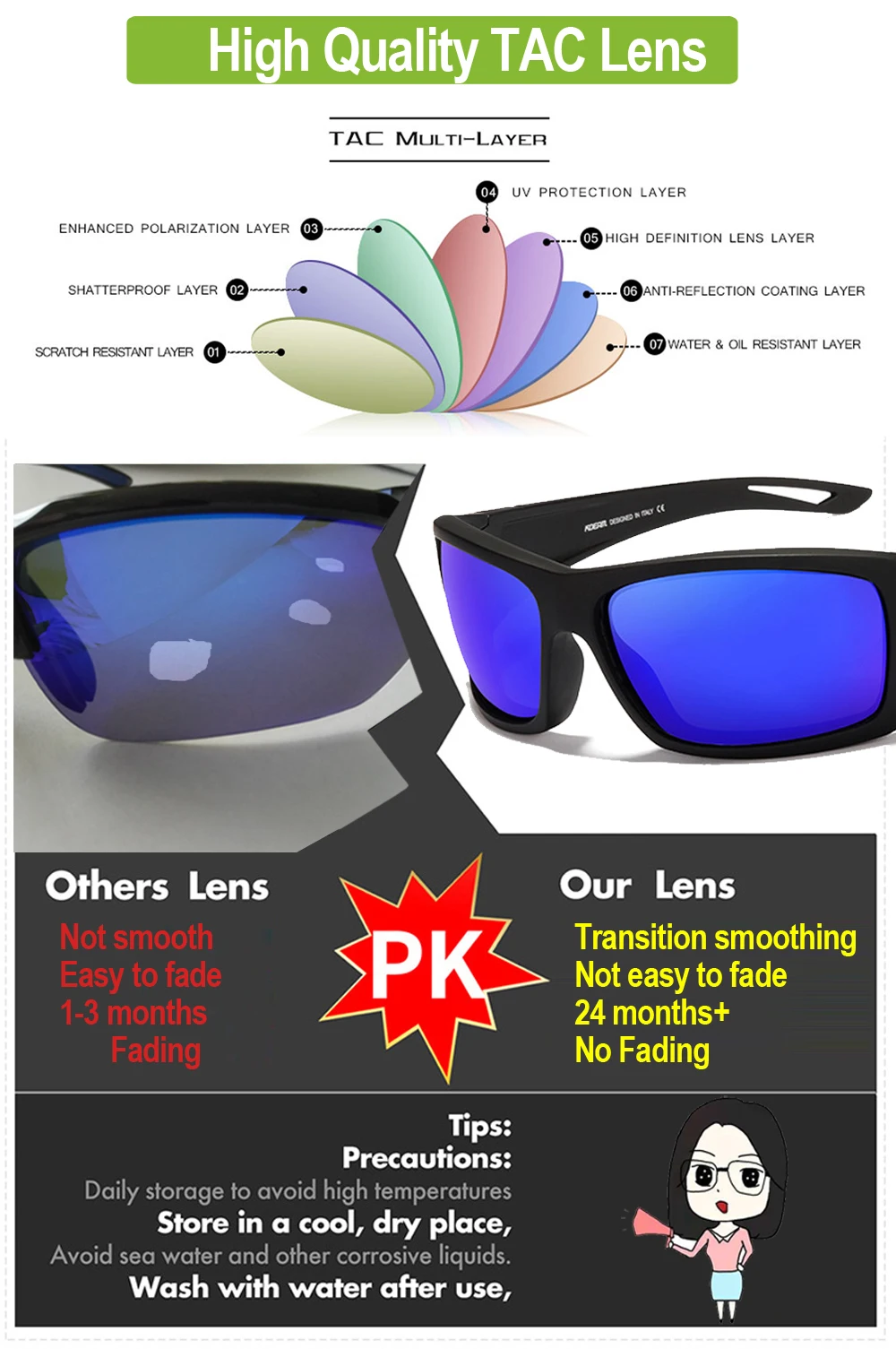 TAC поляризованные линзы-100% защита UV400 покрытие, Блокирует 100% вредных UVA и UVB лучей. Восстанавливает истинный цвет, устраняет отраженный светильник, рассеянный светильник, отлично защищает глаза. Объектив TAC включает 7 слоев. Первый слой-поляризационный слой. 2-й и 3-й слои имеют склеенные слои для обеспечения долговечности. 4-й и 5-й слои являются слоями защиты от УФ, чтобы поглощать уф-светильник. 6 и 7 слоев являются Небьющимися слоями.