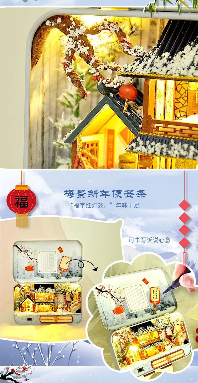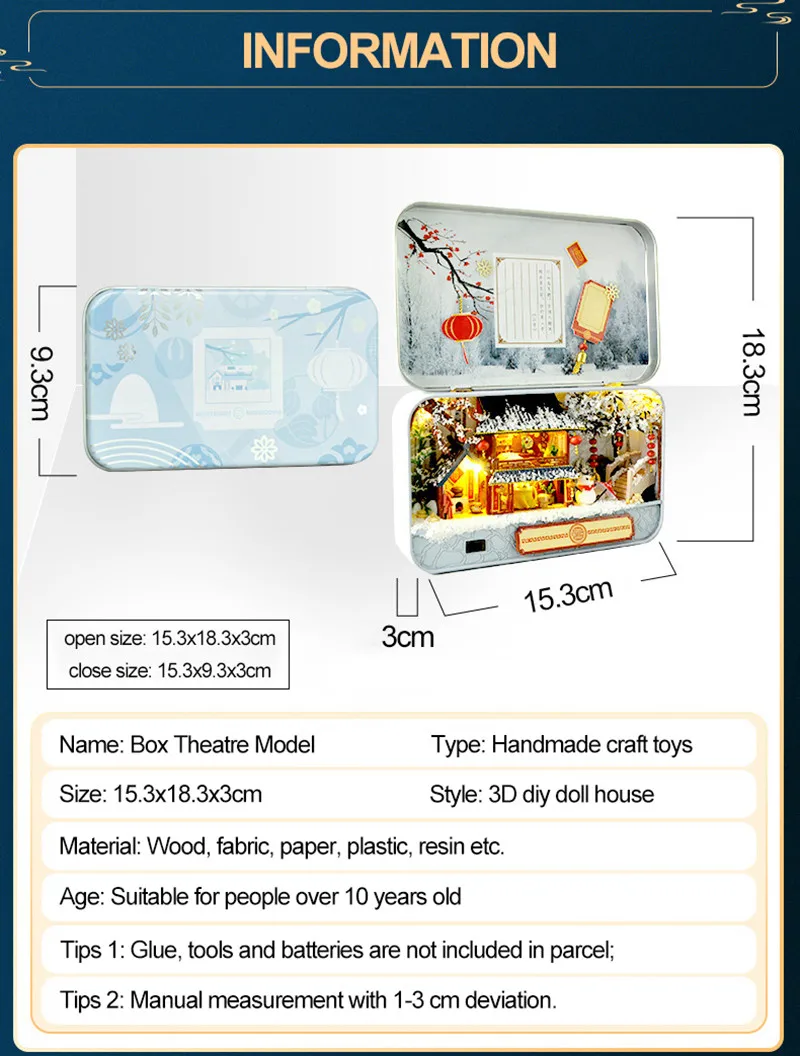 1. Не включает клей/инструменты/аккумулятор 2. Необходимые инструменты ручной работы: бумажные ножницы, линейка, нож, отверстие, точный пинцет, отвертка, клей 3. Товар поставляется с частями, необходимо собрать 4. Название: китайский внутренний двор Размер коробки: около 15,3*9,3*3 см Открытый Размер: около 15,3*18,3*3 см Материал: дерево, ткань, бумага, пластик, смола и т. Д. 5. Название: Бокс-театр Размер коробки: около 14,3*2,6*8,4 см Размер в открытом виде: около 14,3*2,6*16,4 см Материал: дерево, ткань, бумага, металл, светодиодный светильник и т. Д. Советы: 1. Содержит мелкие детали, пожалуйста, будьте осторожны, чтобы не есть по ошибке 2. Ручное измерение с отклонением в 1-3 см.