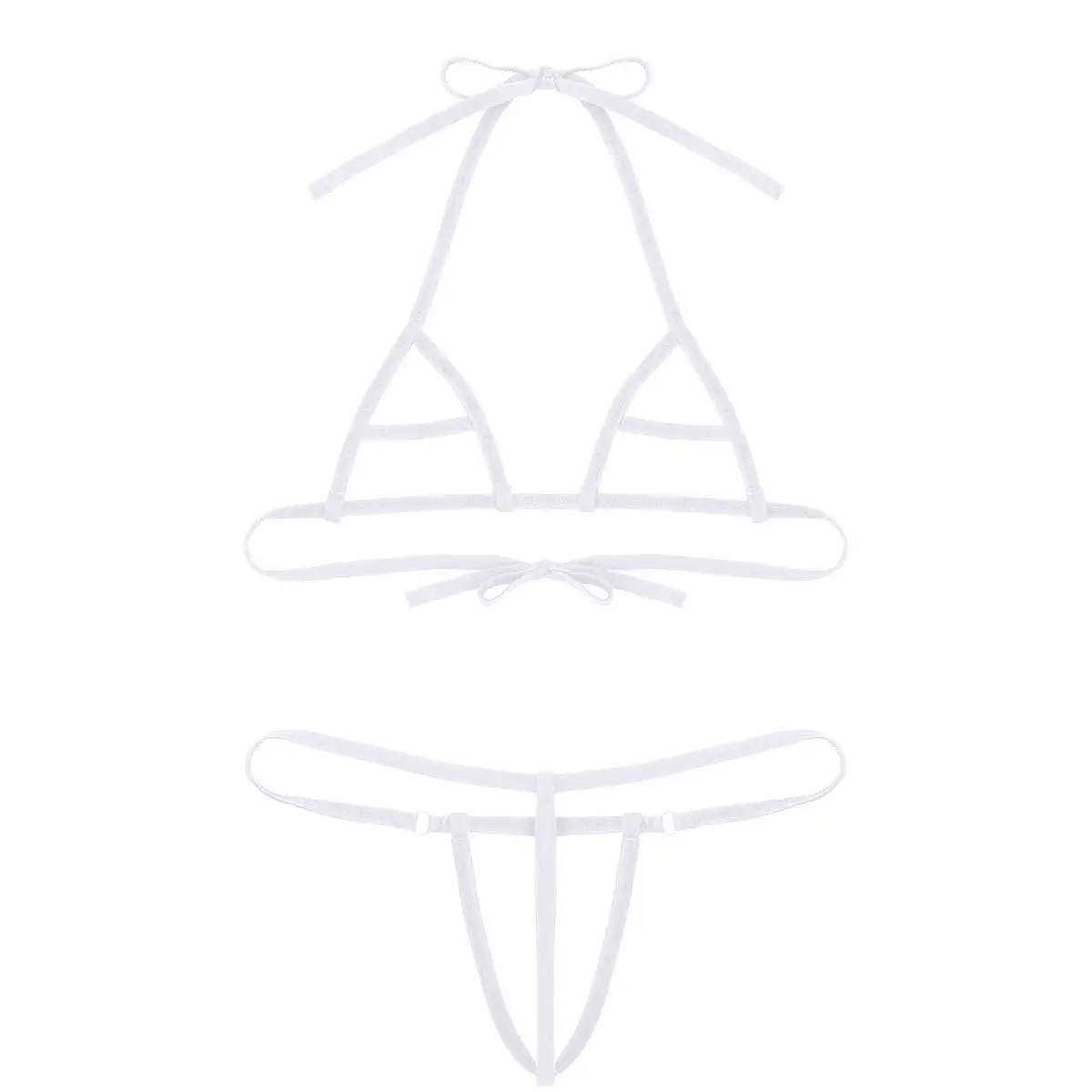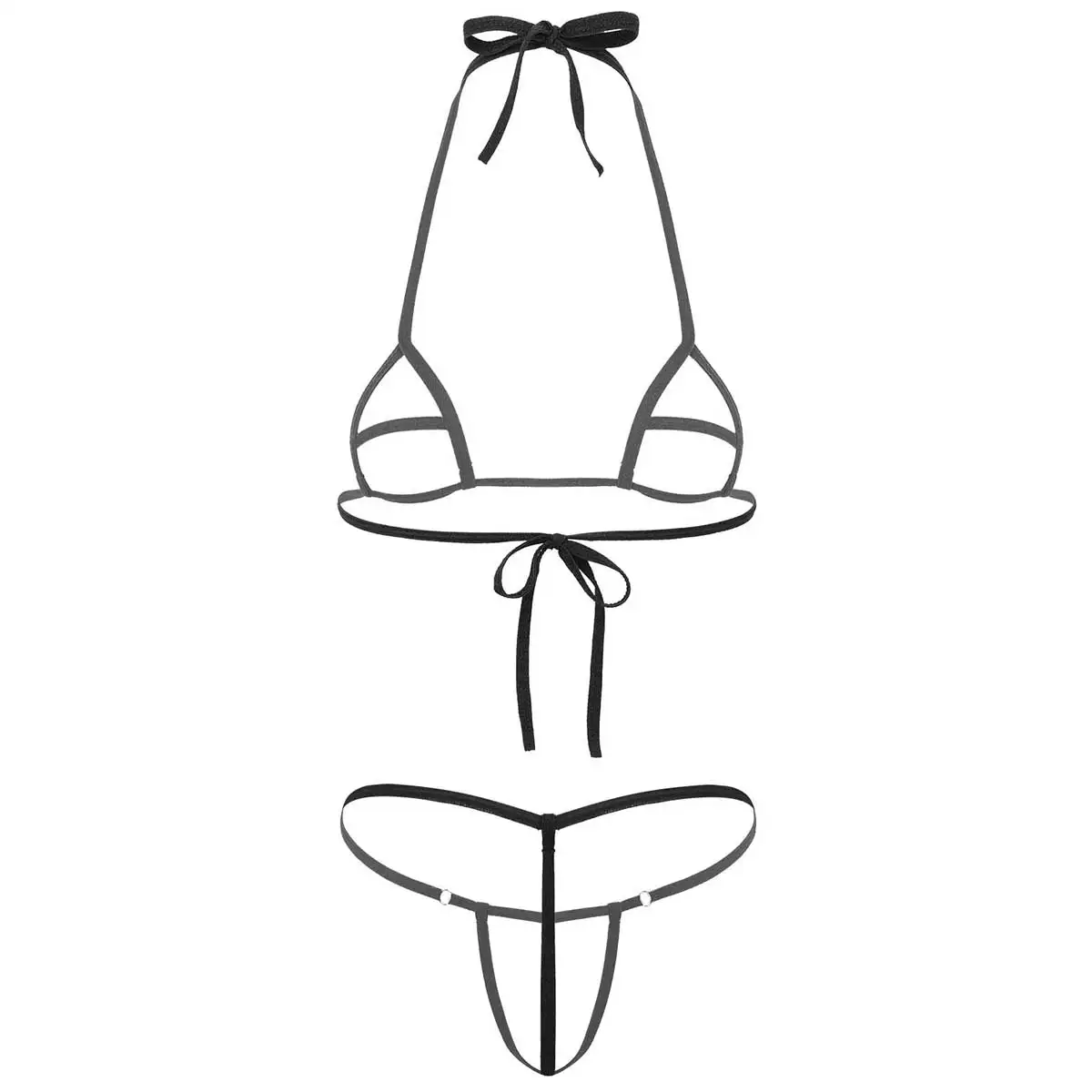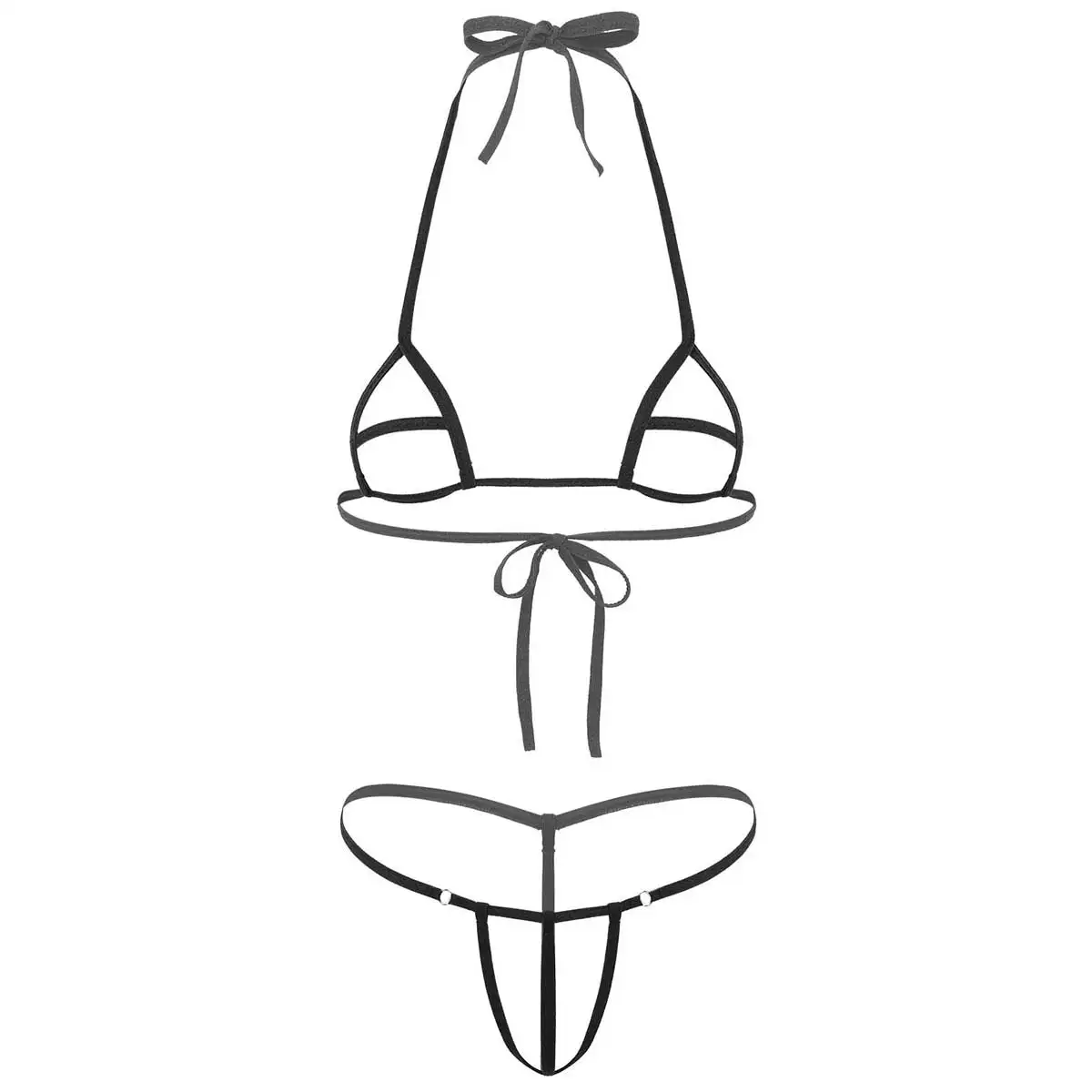 Женский эротический сексуальный Набор белья бикини из 2 предметов, мини-Бюстгальтер с завязками на шее и завязками на шее, топ с Т-образной спинкой, стринги, трусики, нижнее белье