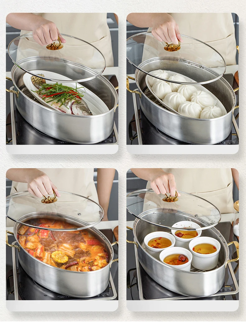 Отлично подходит для тушения рыбы. Изготовлен из нержавеющей стали 304. Отпариватель длинного диаметра 38 см: легко варить.