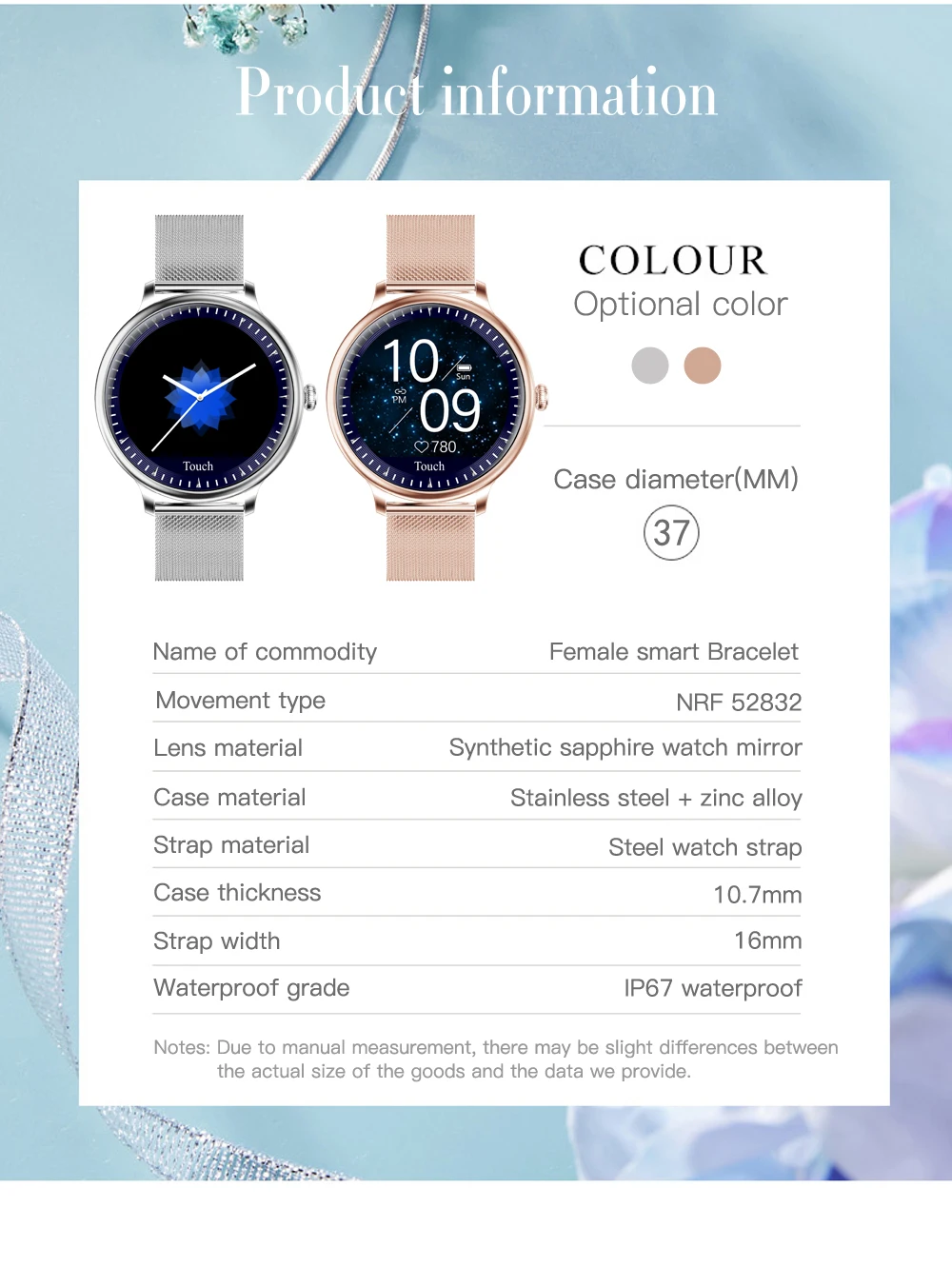 NY12 стильные женские умные часы с круглым экраном, умные часы для девушек, монитор сердечного ритма, Совместимость с Android и IOS