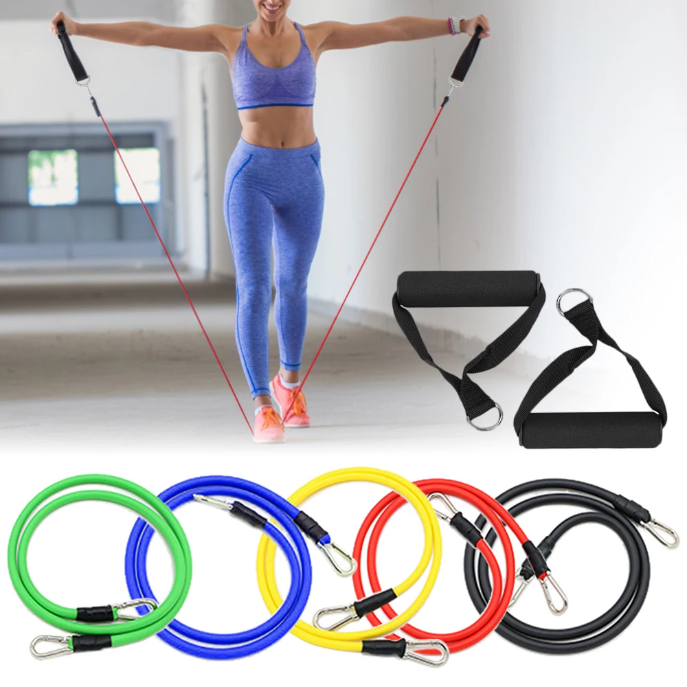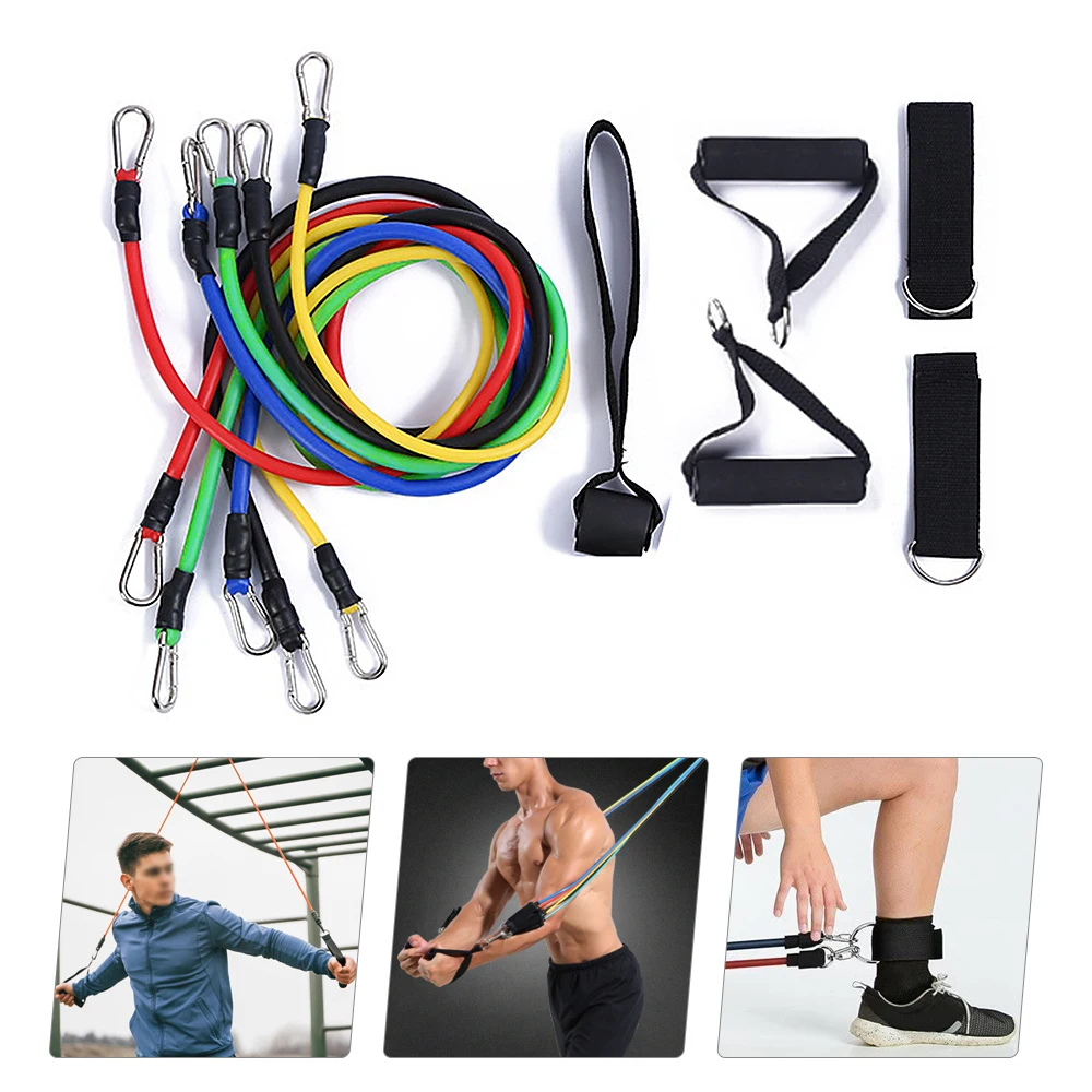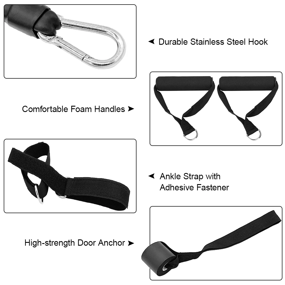 Набор браслетов для фитнеса из 11 шт. состоит из 5 различных трубки ленты, 2 мягких ручки, 1 дверной якорь, 2 ремешка на лодыжке и 1 сумка для переноски.