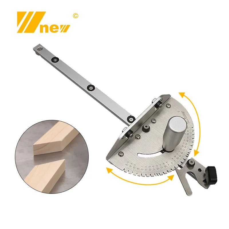 Description: - A miter gauge consists of a long thin guide, which rides in the miter slot of your table saw (some band saws also have miter slots), and guides the miter gauge parallel to the blade. - Attached to this guide is a half-moon shaped piece that pivots on its connection point to the guide. - A locking mechanism then allows this pivoting section to be locked into any angle. - A board is placed against the flat section of the gauge and the entire assembly (miter gauge and board) is slid forward, allowing the saw blade to cut the end of the board at the prescribed angle.
