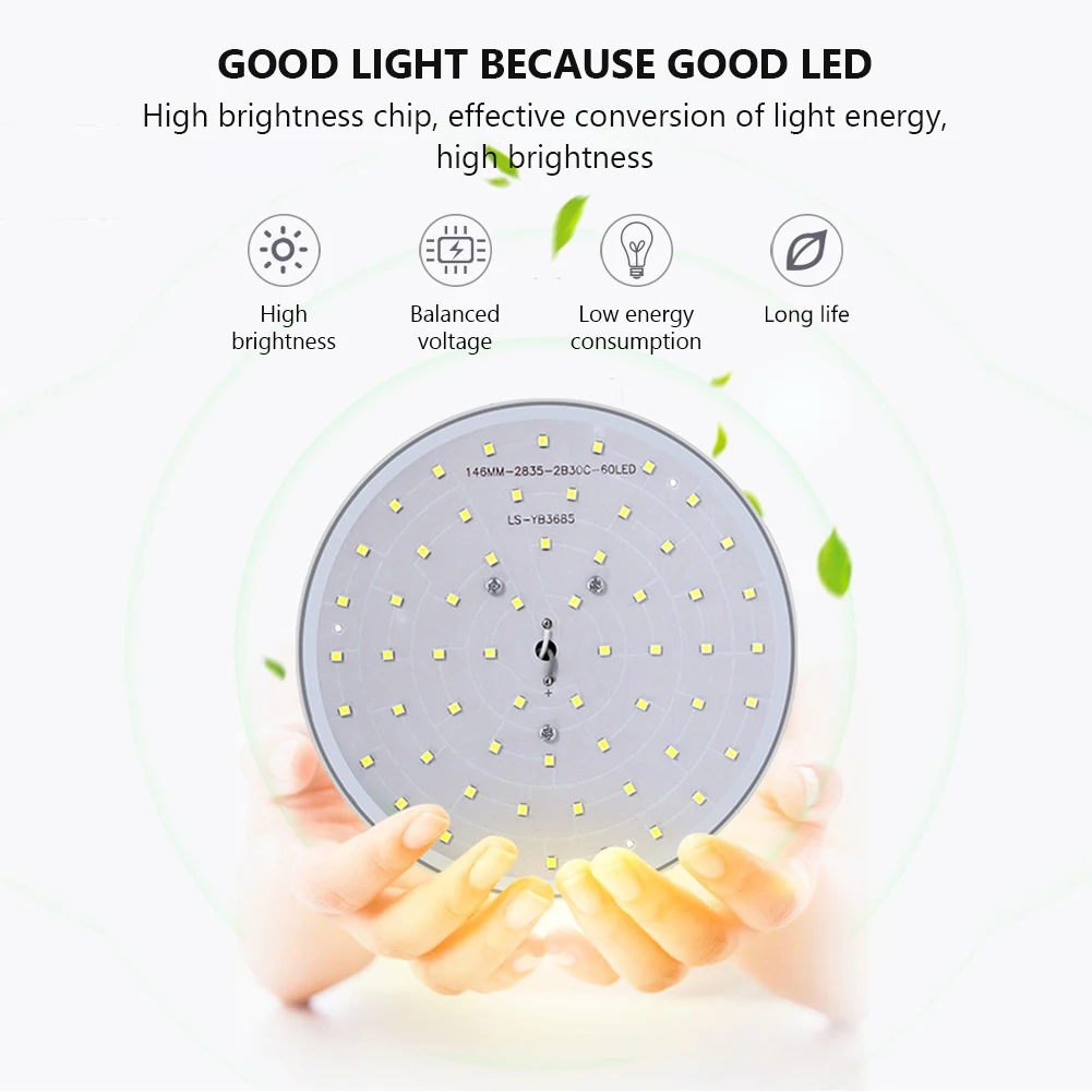 Мощность Цветовая температура Светодиодный индикатор Диаметр Толщина Область применения 15 Вт Холодный белый/ Теплый белый 44 шт. SMD2835 118 мм/4,64" 45 мм/1,77" 5 ~ 8㎡ 20 Вт Холодный белый/ Теплый белый 60 шт. SMD2835 150 мм/5,90" 45 мм/1,77" 7 ~ 11㎡ 30 Вт Холодный белый/ Теплый белый 80 шт. SMD2835 185 мм/7,28" 45 мм/1,77" 10 ~ 16㎡ 50 Вт Холодный белый/ Теплый белый 100 шт. SMD2835 220 мм/8,66" 45 мм/1,77" 17 ~ 28㎡