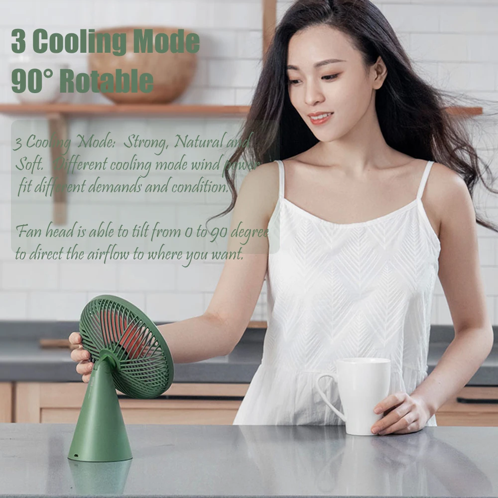 3 режима охлаждения и 90 ° Rotable--- 3 режима охлаждения: сильный, естественный и мягкий. Различные режимы охлаждения ветровая мощность подходит для различных требований и условий. Головка вентилятора может наклоняться от 0 до 90 градусов, чтобы направлять поток воздуха туда, куда вы хотите.