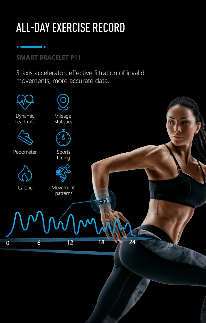 ● 24-часовой непрерывный мониторинг и анализ кровотока под кожей через светодиодный датчик зеленого света, частота сердечных сокращений отображается в режиме реального времени с помощью фото-электрического метода отслеживания импульсных волн. (Данные только для справки)