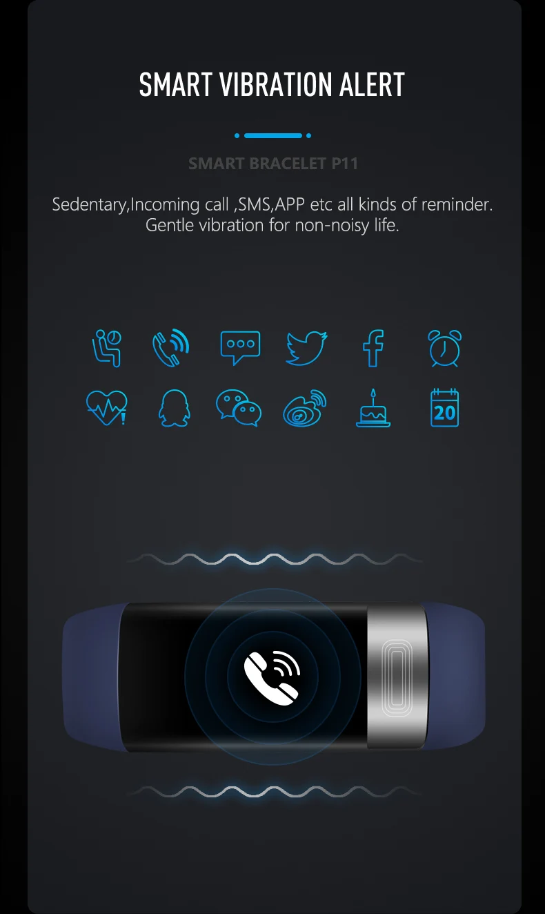 ● Поддержка будильника, питья воды, сидения, звонков, SMS (сообщения, QQ, Wechat, Skype, Facebook, Twitter, Line, Whatsapp). Часы будут напоминать вам с вибрацией. (включите кнопку уведомления от «Управление устройством-напоминание»