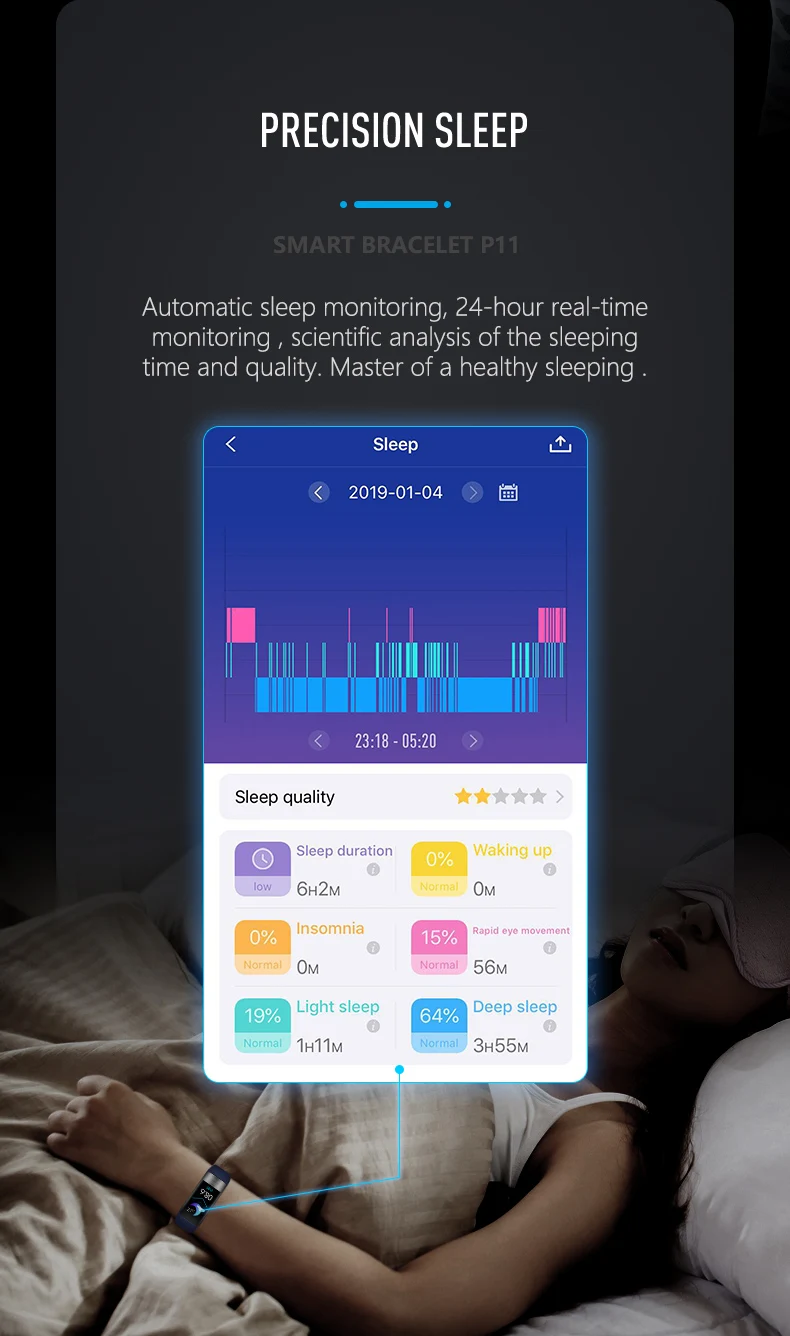 ● Во время сна группа автоматически контролирует, как долго и как хорошо вы спите. Пожалуйста, установите время сна из «личной информации». (Пожалуйста, носите браслет во время сна, чтобы записать данные о вашем сне)