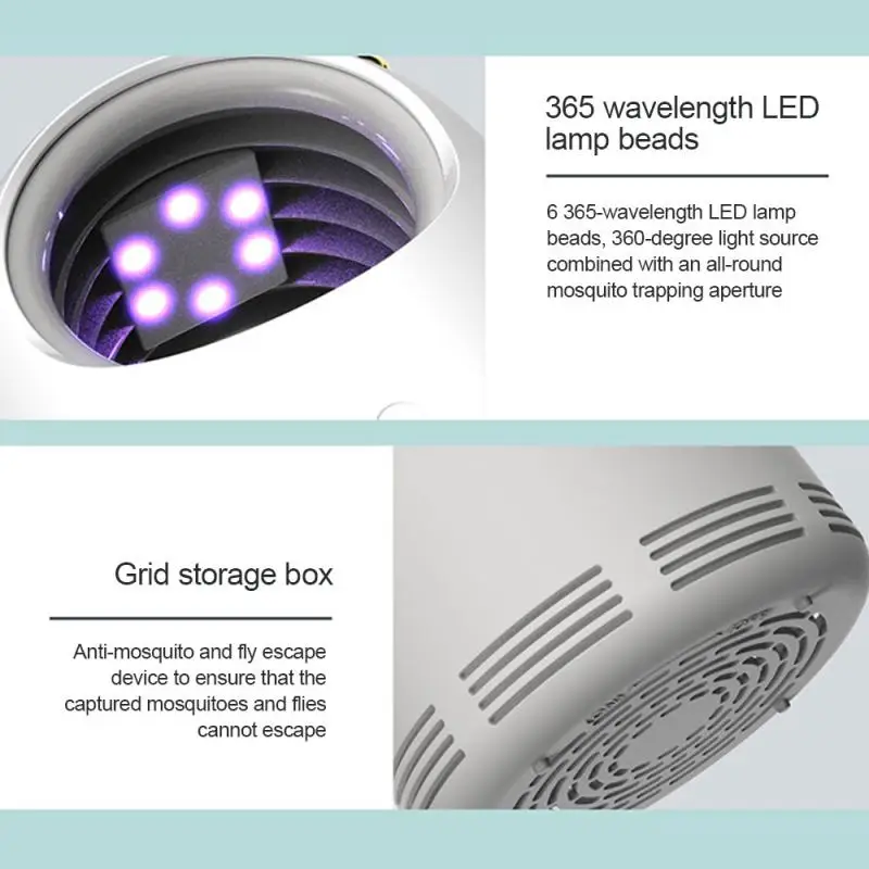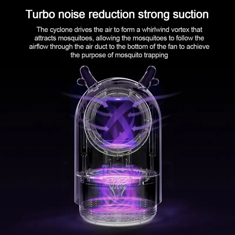 * Используя бесшумный вентилятор постоянного тока, 2000 об/мин высокая сила всасывания для перемешивания окружающего воздуха, так что комары тесно всасываются в нижней части вентилятора после воздушного потока