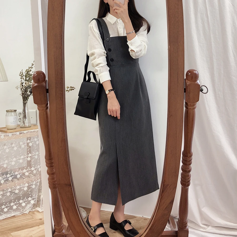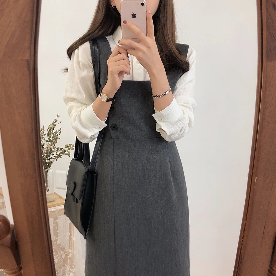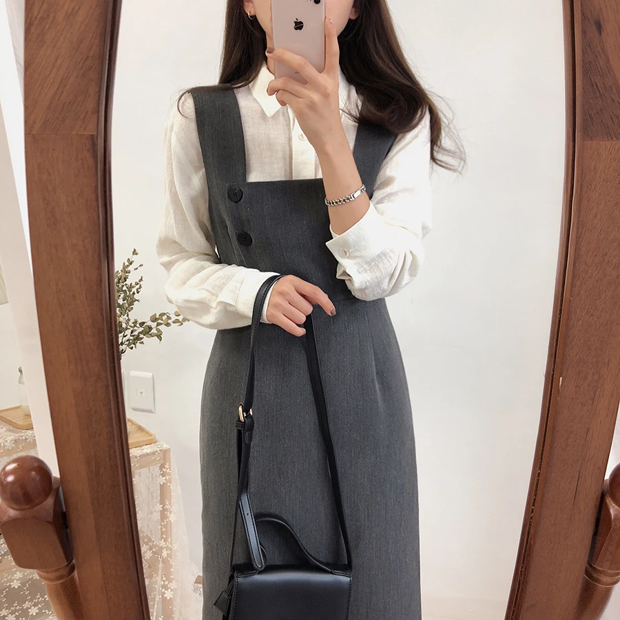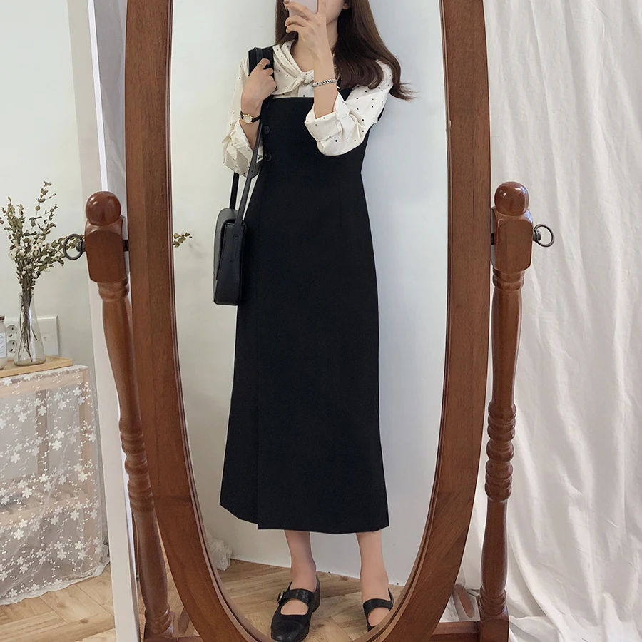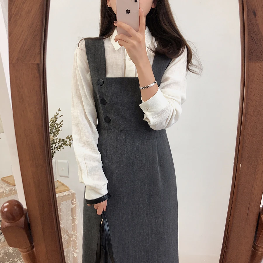 Шикарное платье в южнокорейском стиле для женщин, милые винтажные платья-рубашки в стиле преппи для девушек, на пуговицах, черные подтяжки Flhjlwoc, 5220