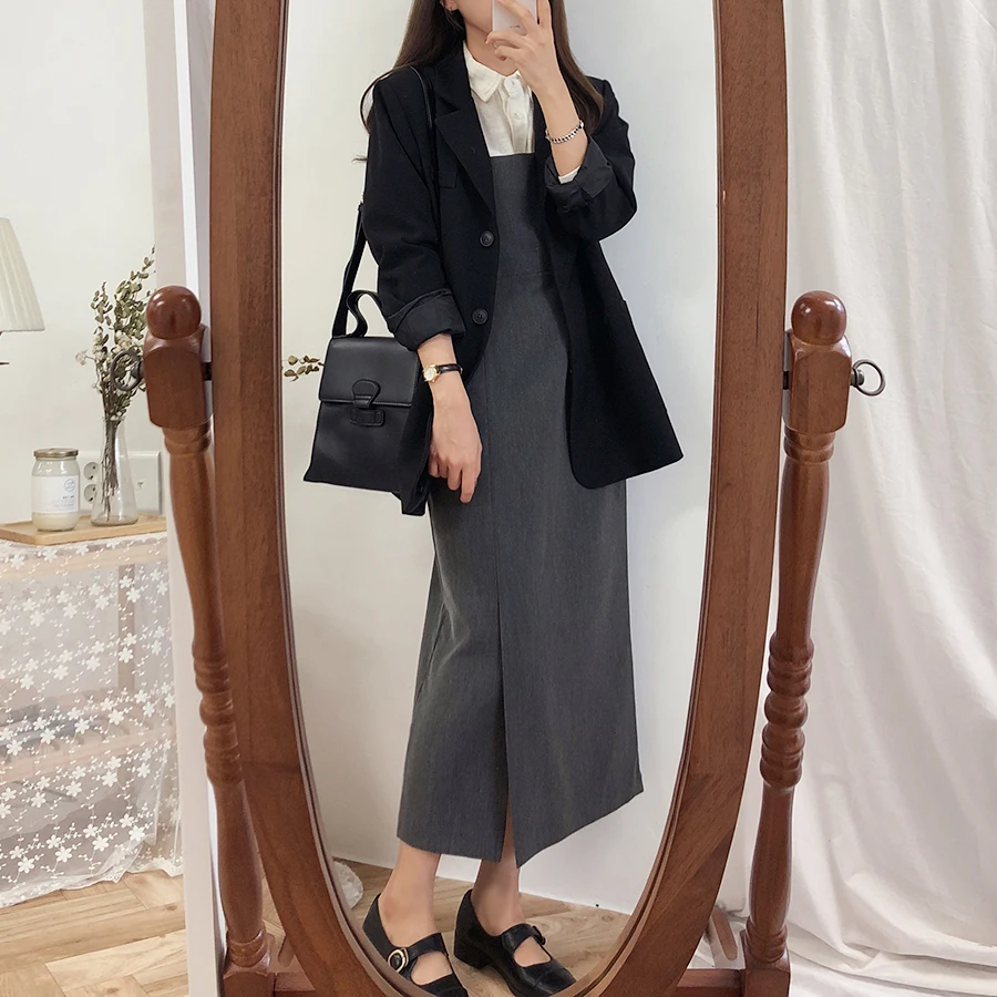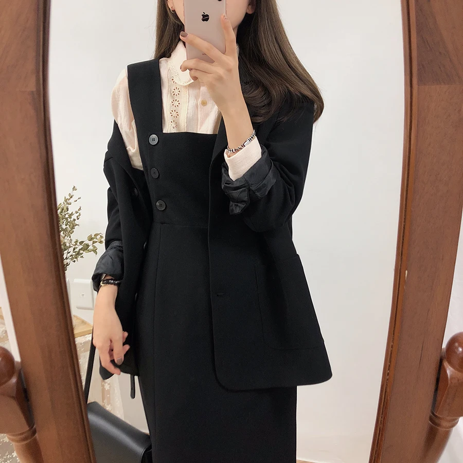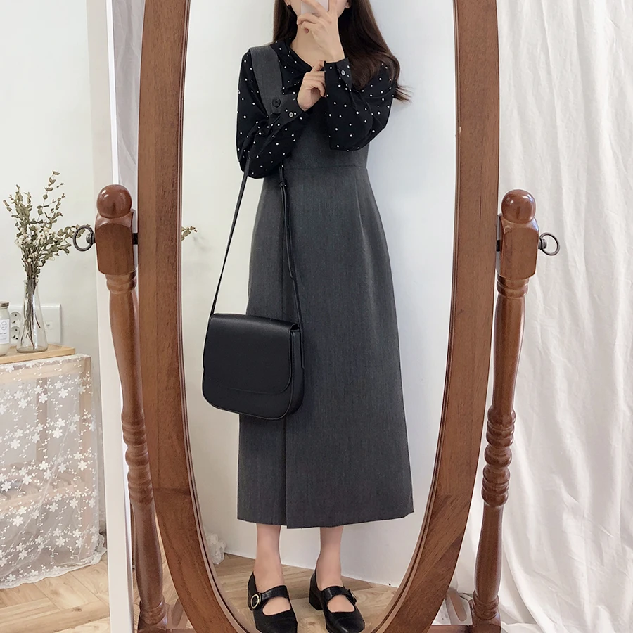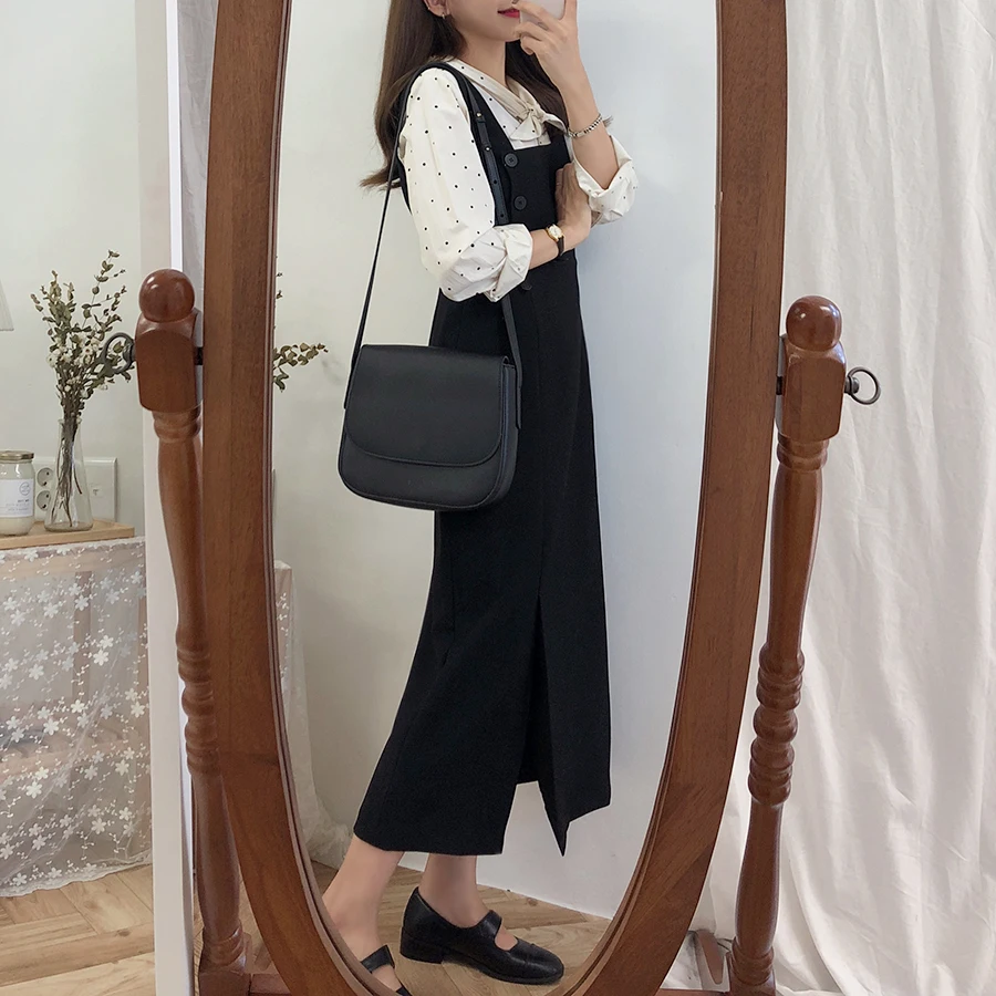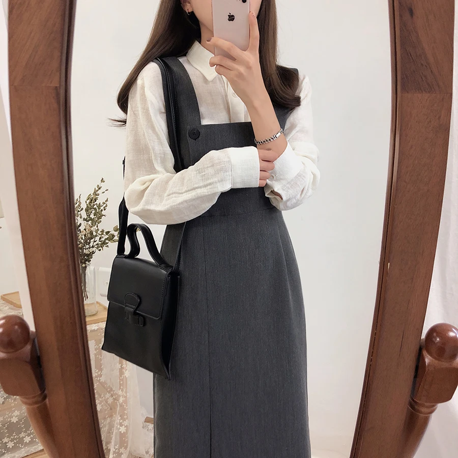 Шикарное платье в южнокорейском стиле для женщин, милые винтажные платья-рубашки в стиле преппи для девушек, на пуговицах, черные подтяжки Flhjlwoc, 5220