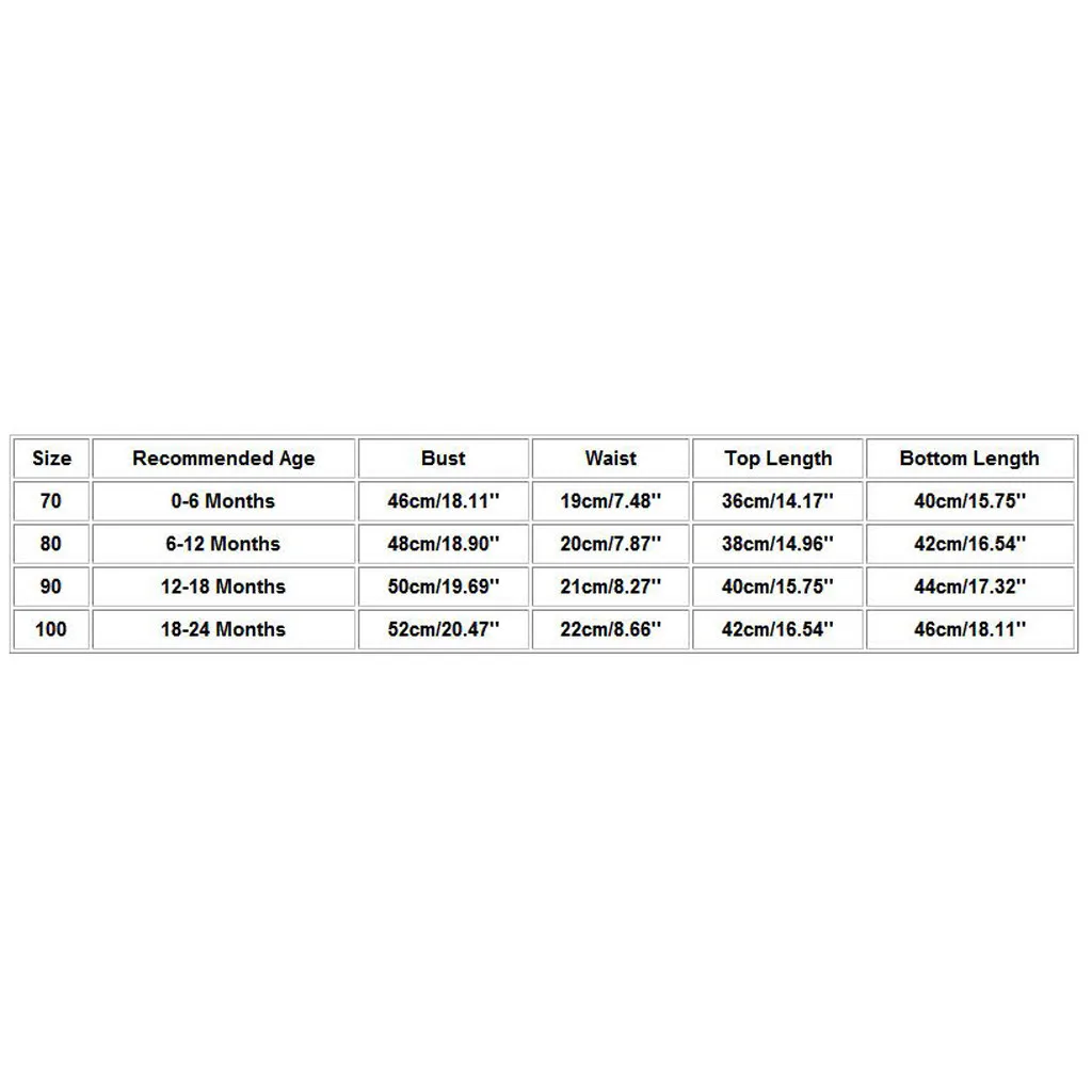 Таблица размеров:Размер Рекомендуемый возраст Бюст Талия Длина верха Длина низа 70 0-6 месяцев 46 см/18,11'' 19 см/7,48'' 36 см/14,17'' 40 см/15,75'' 80 6-12 месяцев 48 см/18,90'' 20 см/7,87'' 38 см/14,96'' 42 см/16,54'' 90 12-18 месяцев 50 см/19,69'' 21 см/8,27'' 40 см/15,75'' 44 см/17,32'' 100 18-24 месяцев 52 см/20,47'' 22 см/8,66'' 42 см/16,54'' 46 см/18,11''