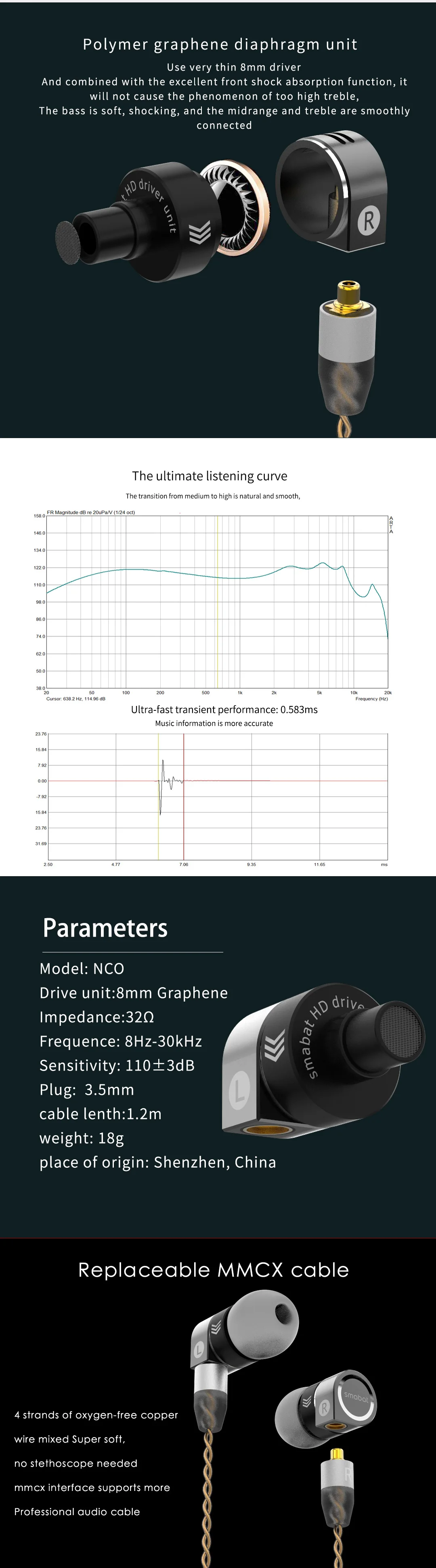 Smabat NCO металлические вкладыши 8 мм графеновая диафрагма Динамический драйвер HIFI бас в ухо наушники отсоединить MMCX ST10s M1Pro TINHIFI T4 P1