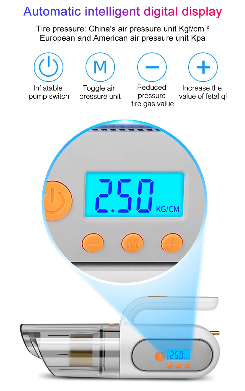 Инфляция + вакуум + давление в шинах + Освещение все-в-одном машина. Множественная система фильтрации для разделения пыли и газа, удерживает частицы от входа в машинное отделение, чтобы блокировать двигатель и разрядить чистый воздух. Сильная мощность, чтобы быстро увеличить скорость надувания, установить значение и автоматически остановить, когда переключатель заполнен. Автоматический интеллектуальный цифровой синий светильник. Обнаружение давления в шинах в любое время, в любом месте, цифровой циферблат с первого взгляда.