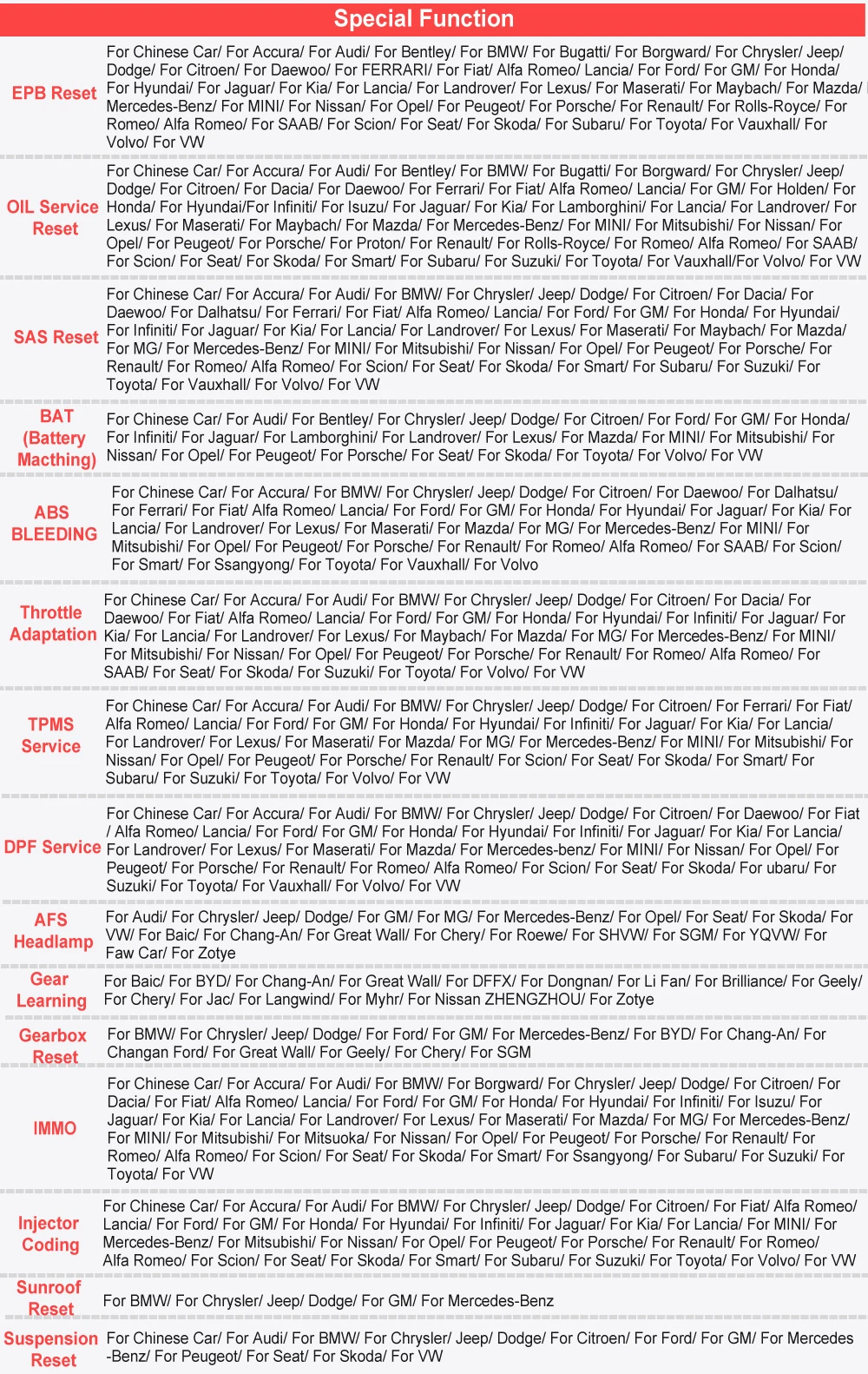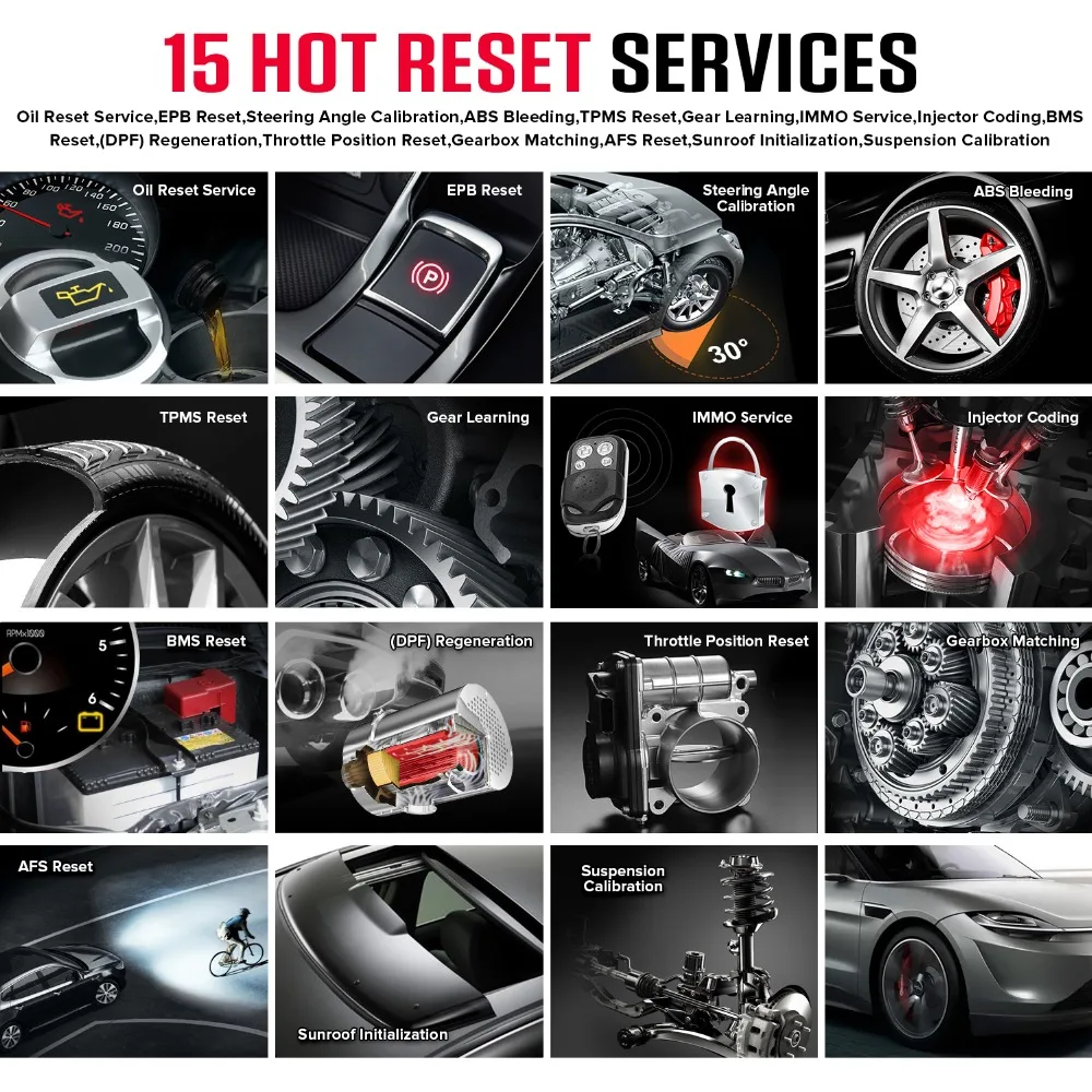 Запуск CRP909E поддержка ниже 15 видов функций обслуживания:В дополнение к удивительной и мощной диагностической функции, CRP909E также имеет различные функции обслуживания. Наиболее часто выполняемые Сервисные функции включают:1. Обслуживание сброса масляной лампыПозволяет выполнить сброс для нового расчета системы жизнедеятельности моторного масла после изменения масла.2. Сброс электронного стояночного тормоза EPBЭто важно для поддержания безопасности и эффективности электронной тормозной системы.3. Батарея летучей мышиПозволяет сканировать устройство, чтобы оценить состояние заряда батареи, контролировать ток замыкания, зарегистрировать замену батареи и активировать остальное состояние транспортного средства.4. Сброс дизельных Сажевых фильтров DPFСпециально работает для дизельных Сажевых фильтрующих систем с регенерацией DPF, замена компонентов DPF после замены блока управления двигателем.5. Сброс датчика рулевого управления SASПомогает очистить воспоминания датчика угла поворота руля и играет важную роль в калибровке датчика угла руля.6. Сброс системы контроля давления в шинах TPMSИмеет смысл в отображении сенсорных идентификаторов из Эбу транспортного средства, вставке TPMS сенсорных сменных идентификаторов и датчиков тестирования.7. Программирование ключа IMMOУникальная функция программирования автомобильных ключей и считывания ПИН-кода, она в основном используется для отключения ключей от утерянного транспортного средства и программирования нового сменного ключа fob.8. Кровотечение из АБС-пластикаABS тормозное кровотечение, чтобы получить твердую тормозную колодку После истощения воздуха после ремонта ABS насосной системы.9. Сброс крыш солнцаSunroof должен быть сброшен, когда блок управления sunroof имеет коммуникационную проблему или изменен.10. Сброс подвескиПопробуйте сбросить электронное пневматическое колесо Подвески с системой массажа закройте все двери koeo flip через систему сообщений перейти к сбросу подвески или выключению.11. Сброс коробки передач (коробки передач)Процедура сброса передачи Адаптивное обучение DIY. Запуск автомобиля и вождение. Как только вы выполните эту процедуру, блок управления двигателем (ECU) и блок управления передачей (TCU) будут работать вместе, чтобы узнать, как Вы управляете, отслеживая ваш шаблон вождения. После того, как вы выполните этот метод программирования TCU / ECU, Управляйте автомобилем.12.AFS сброс фары«AFS» означает адаптивную систему переднего освещения (в ночное время с би-ксеноновыми фарами), она поворачивается с обеих сторон, Нажатие этой кнопки означает, что они остаются направленными вперед и не поворачиваются, когда вы поворачиваете руль.13. Кодирование инжектораУтечки инжекторов и некоторые мертвые инжекторы могут быть пропущены даже когда инжектор отключен. Другие проблемы с системой зажигания и механическими компонентами также могут не показывать потерю оборотов в минуту при выключении инжектора.14. Адаптация дроссельной заслонкиКорпус дроссельной заслонки представляет собой трубу с поворотным плоским клапаном (бабочкой), которая используется для контроля количества воздуха, входящего в двигатель. В автомобиле с электронным топливом Датчик положения дроссельной заслонки и датчик воздушного потока связываются с компьютером, который поставляет соответствующее колич