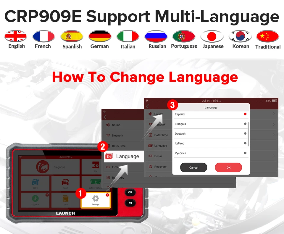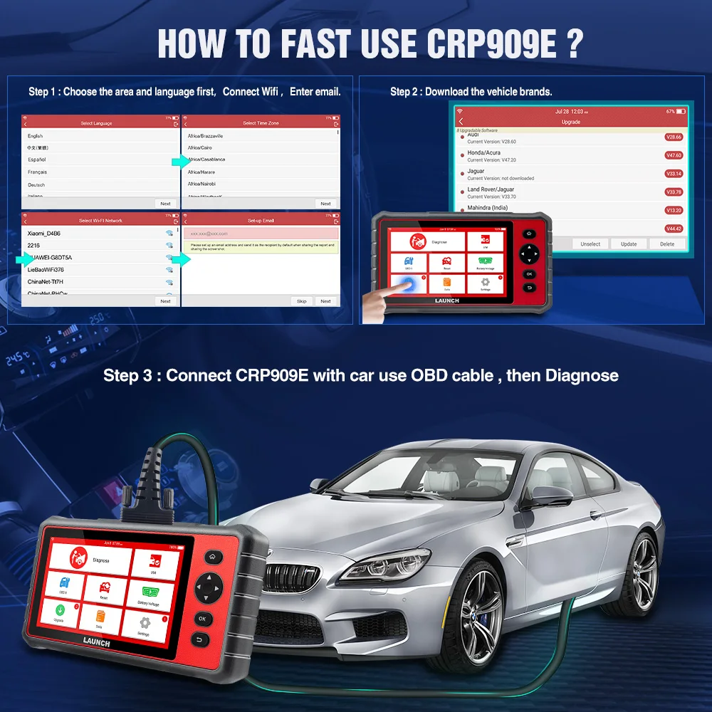 Как быстро использовать CRP909E:Шаг 1:Сначала Выберите язык области, подключите wifi, введите адрес электронной почтыШаг 2:Загрузить автомобильные брендыШаг 3:Подключите CRP909E к автомобильному кабелю OBD, затем диагностируйте