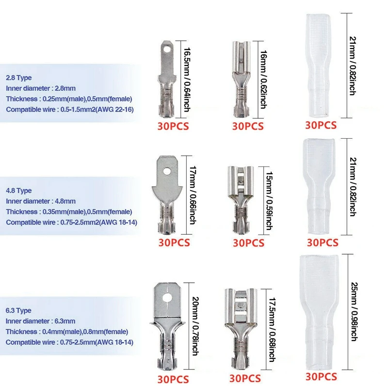 4,8 Тип: Внутренний диаметр: 4,8 мм, толщина: 0,35 мм (папа), 0,5 мм (мама), совместимый провод: 0,75-2.5мм2 (AWG 18-14)