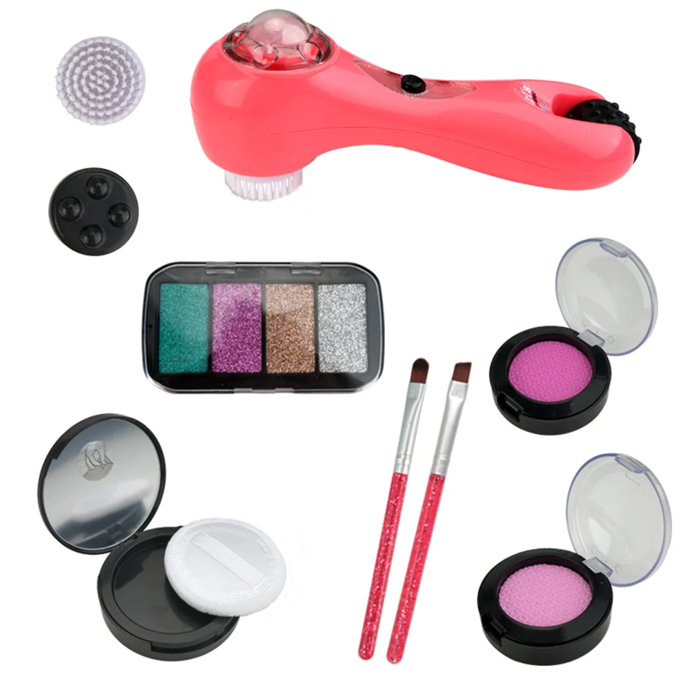 • Продукт поставляется с 1 массажным устройством, 2 массажными насадками, 4 цвета блеска, 1 Подушечная основа, 1 пудра, 2 кисти для макияжа и 2 румян.
