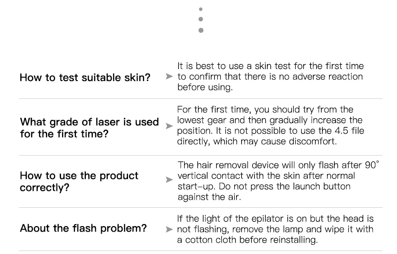 Шаг 1 Удалите лишние волосы путем бритья, эпиляции или воска области перед первым лечением. Шаг 2 Выберите правильный уровень интенсивности. Шаг 3 Включите устройство и нажмите на его к вашей коже. Подождите, пока светильник будет готов к вспышке, чтобы включить и нажать кнопку вспышки.