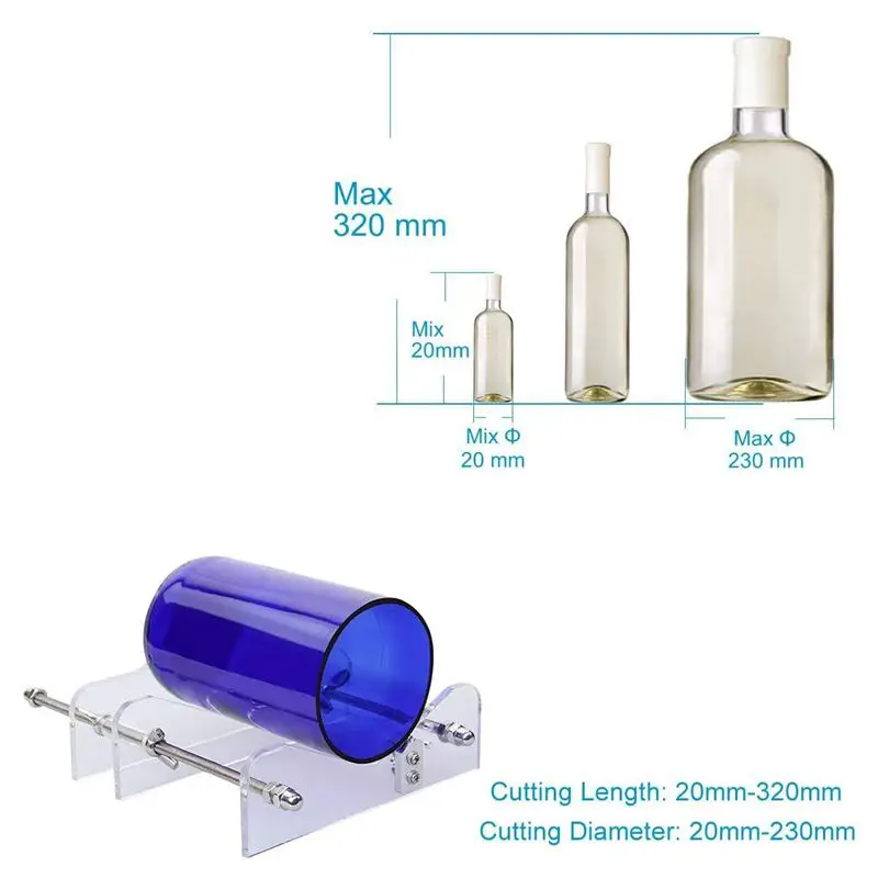 Инструмент предназначен для создания линии очков на бутылке на желаемом месте. Вам просто нужно отрегулировать подставку стеклянного резака до нужной длины, чтобы разрезать и разместить на ней бутылку, затем Отрегулируйте глубину машины, чтобы режущее колесо было в нужном месте на бутылке.