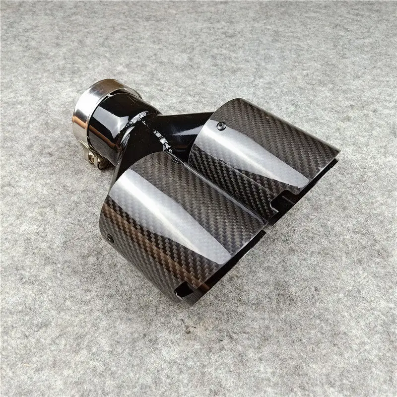 Один Кусок Двойной выход Блестящий углеродное волокно с покрытием глянцевый черный нержавеющая сталь выхлопные двойные трубы Универсальный выхлопной наконечник автомобиля